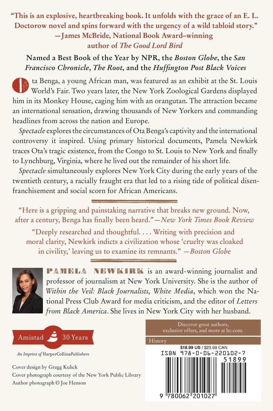 Spectacle explores the circumstances of Ota Benga’s captivity, the international controversy it inspired, and his efforts to adjust to American life. It also reveals why, decades later, the man most responsible for his exploitation would be hailed as his friend and savior, while those who truly fought for Ota have been banished to the shadows of history. Using primary historical documents, Pamela Newkirk traces Ota’s tragic life, from Africa to St. Louis to New York, and finally to Lynchburg, Virginia, where he lived out the remainder of his short life.
