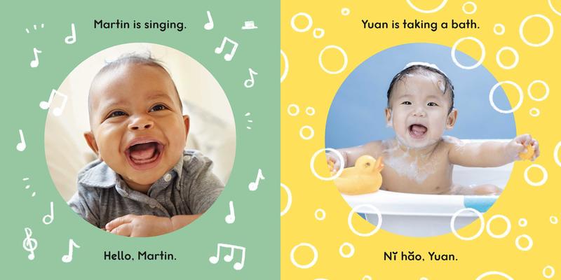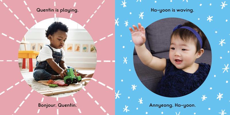 This informative board book introduces simple actions while teaching toddlers how to say "hello" in English, Chinese, French, Korean, Spanish, Arabic, German, Swahili, Navajo, Russian, sign language, Hindi, Portuguese, Japanese, and Italian. The bright photographs of happy children will capture the attention of any baby, and the pronunciation guide will help any reader learn new greetings with ease!