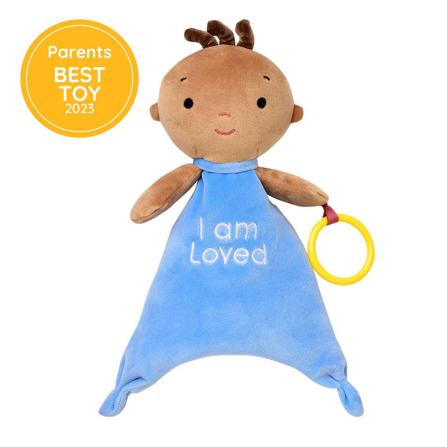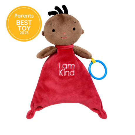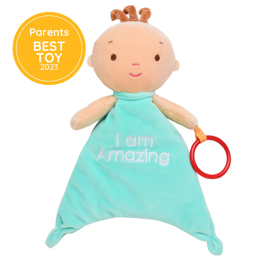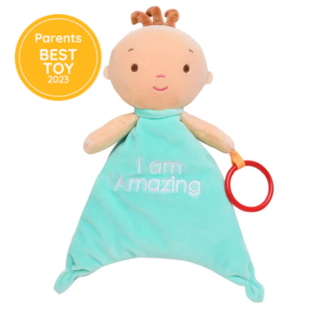 The Positive Pals Soft Snuggler is cuddly and interactive. Babies will be engaged with the soft blanket body accented with satin, knotted corners, a crinkle sound, and a textured teether. The Soft Snuggler is designed to promote self-esteem, empowerment, diversity, and inclusion through play. Each doll has embroidered facial features and sewn-in hair, making it safe and suitable for all ages.