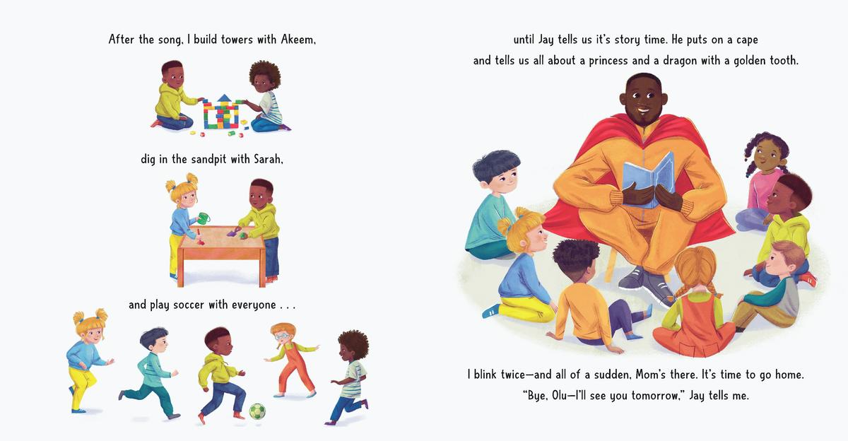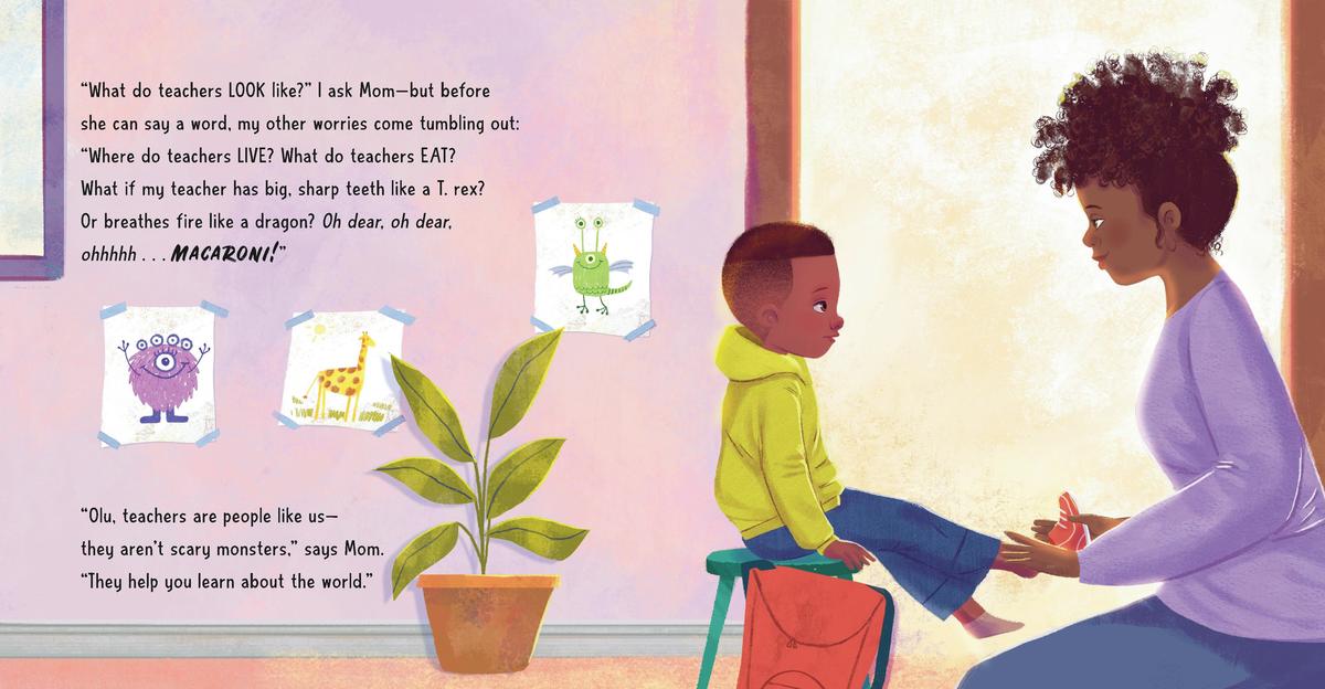 teachers look like? Where do they live? What do they eat? What if his teacher breathes fire, like a dragon? Ohhhhh . . . MACARONI! Luckily for Olu, his parents talk to him about teachers, assuring him they’re just people who help you learn about the world. But as Olu walks with his mom to school, he is still anxious. What will