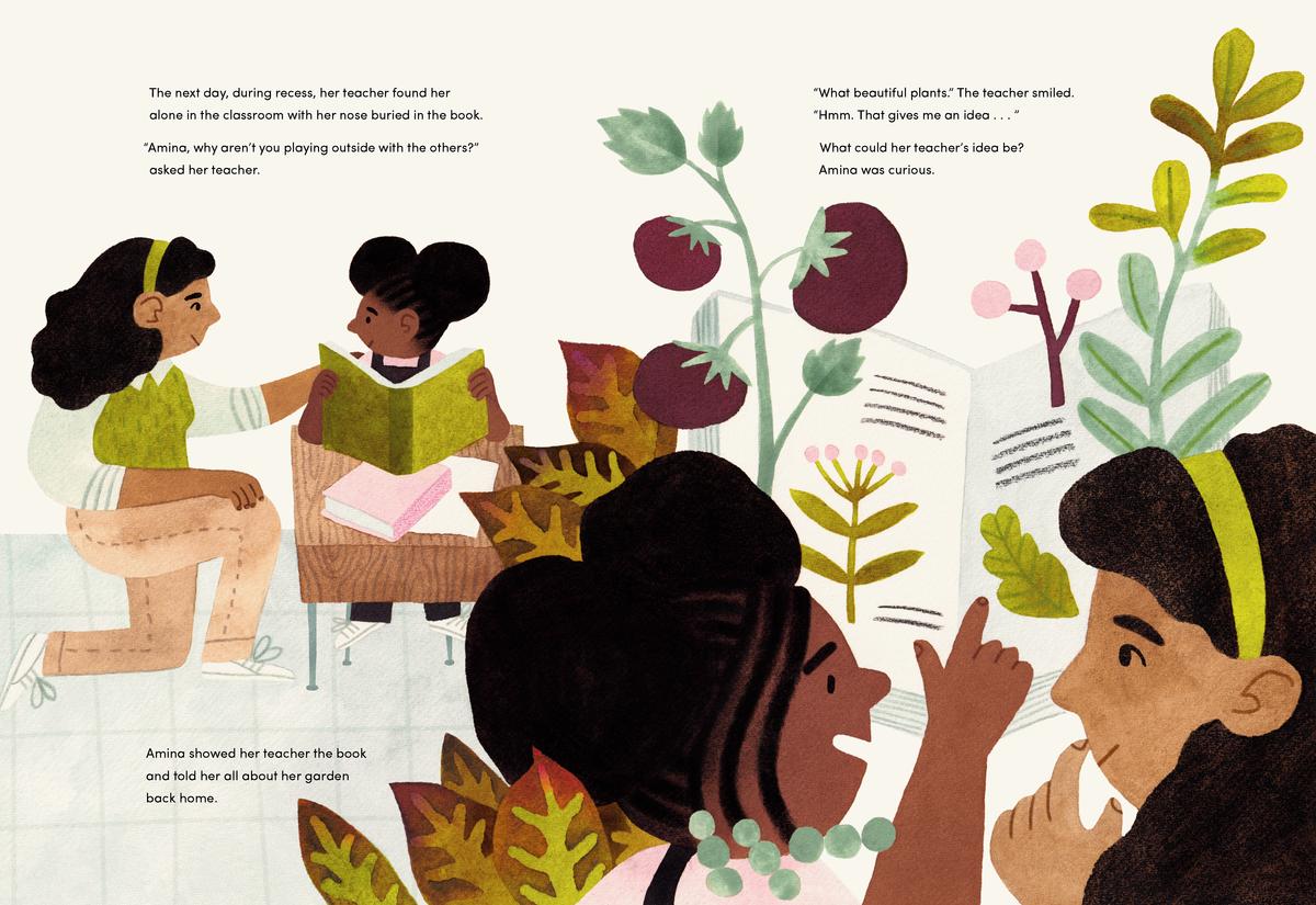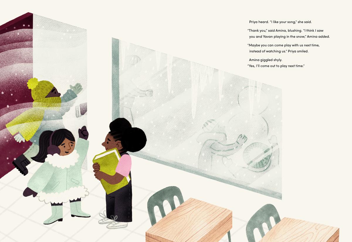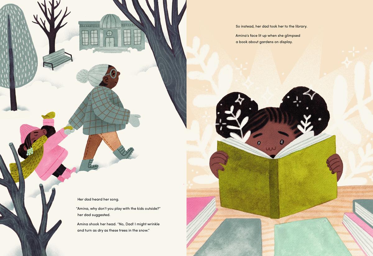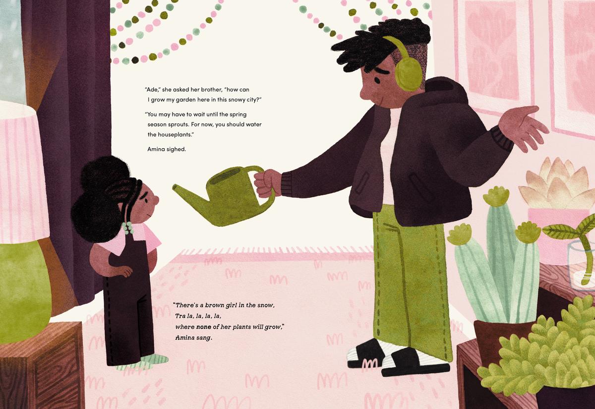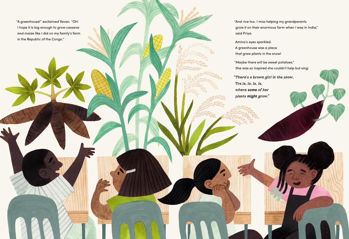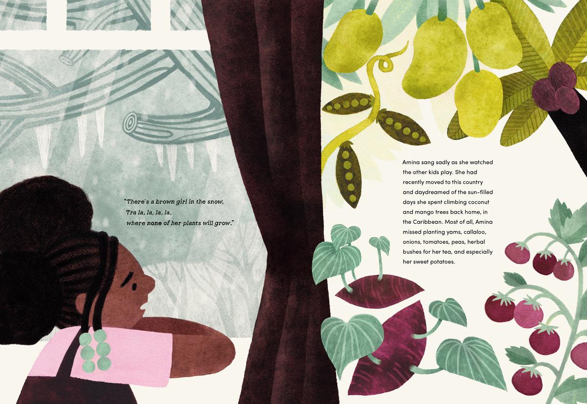 When Amina moves from the Caribbean to a new snowy home, she misses growing her favorite foods. There are no coconut trees to climb, no gardens full of sweet potatoes and callaloo—only ice and snow. As Amina looks out her frosted window, she sings a traditional children’s song from back home, adding her own twist: