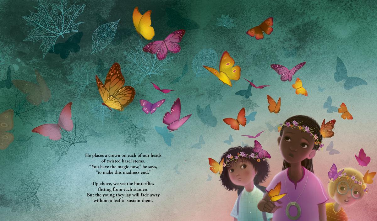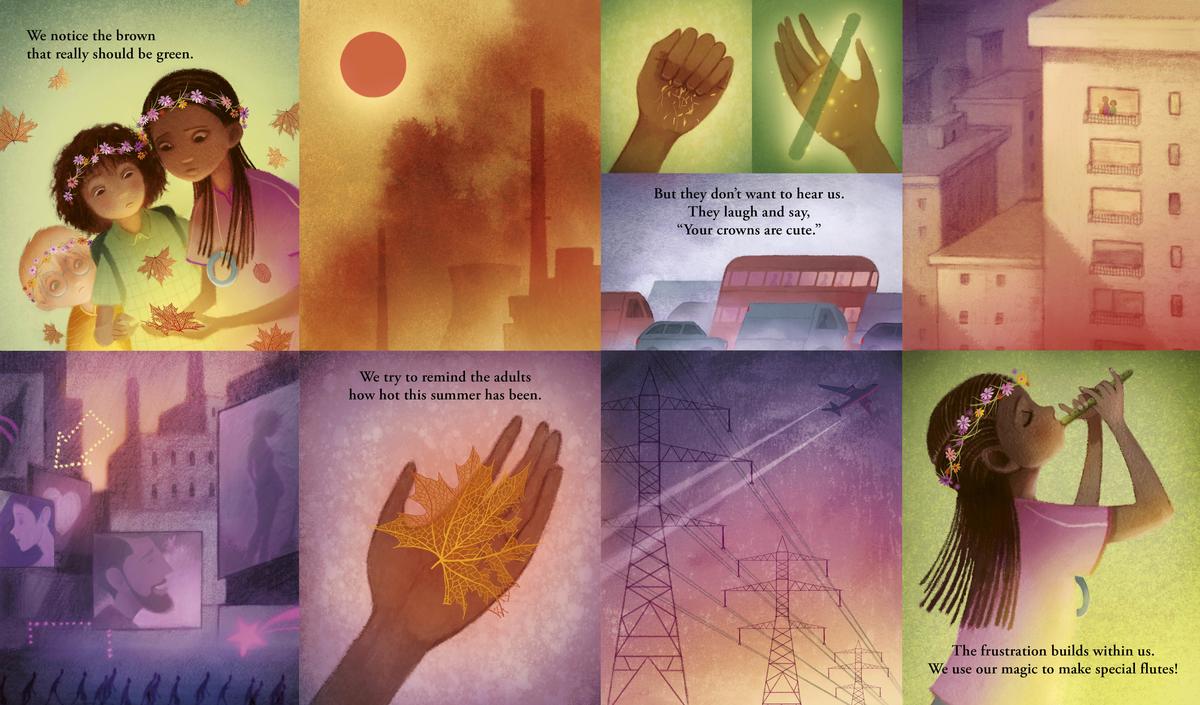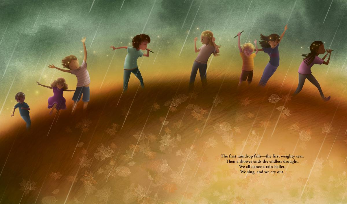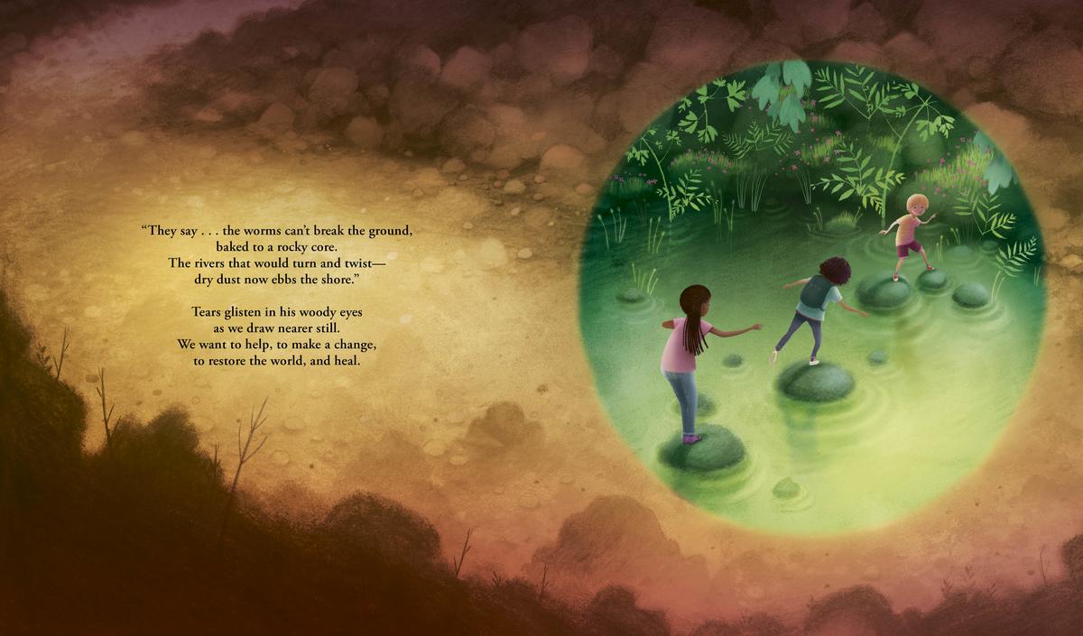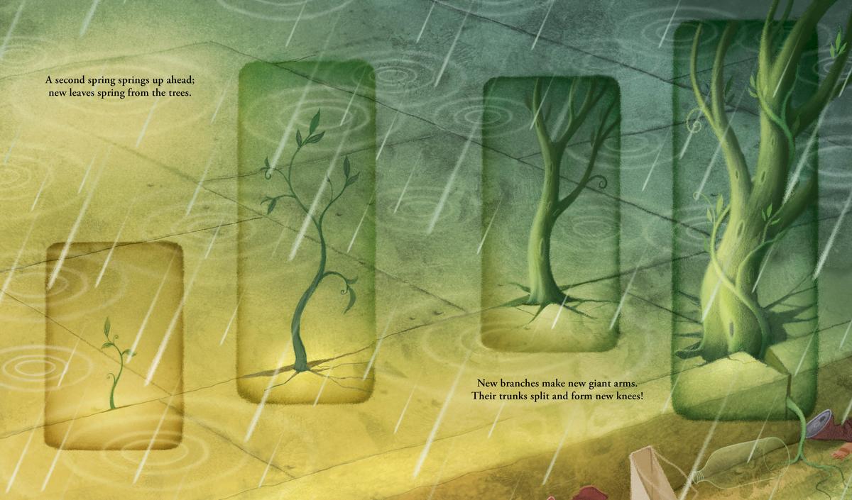 They wonder why the grown-ups are pleased by the good weather, rather than worried for the trees. A wise tree shows the children how to conjure rain and look after the forest, but in bravely finding a short-term solution, they inspire and awaken a long-term commitment in the grown ups around them. Together, they all rediscover the hidden power of reconnecting with nature, setting a topsy-turvy world the right way up, and protecting it for future generations.