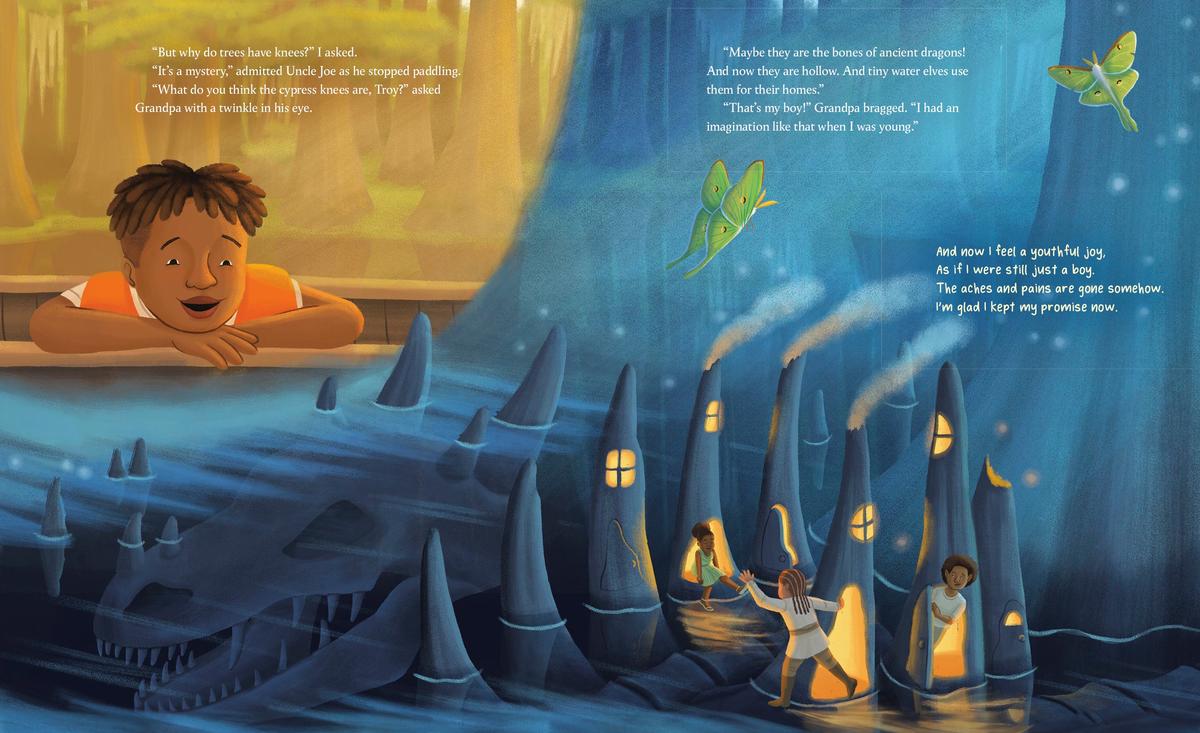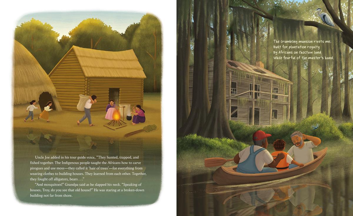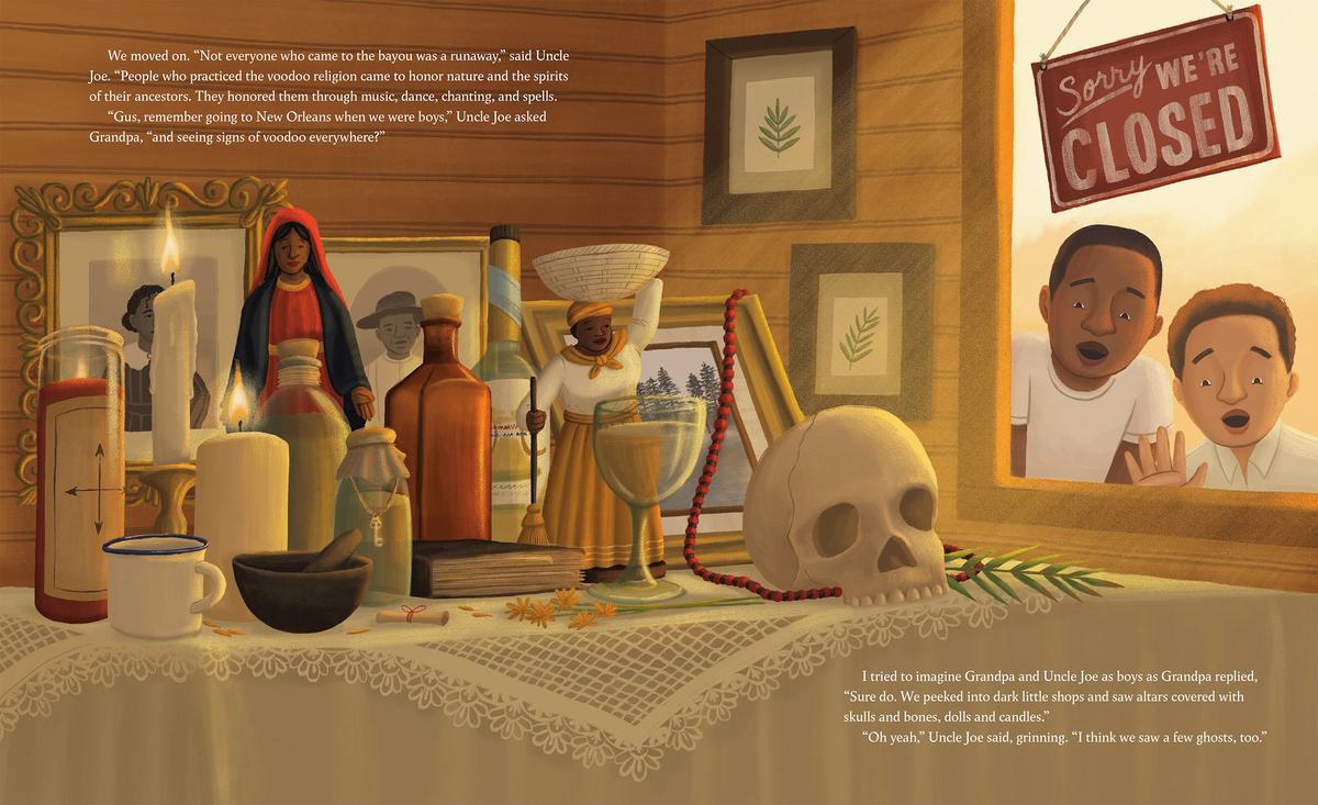 When the time finally comes, Troy and Grandpa climb into Uncle Joe’s pirogue and set off on a unique adventure that stirs up Grandpa's memories and Troy's imagination. Grandpa shares stories about their enslaved ancestors who escaped to the bayou, the ghosts who rise from the moss, and a chorus of creatures that sing around them.