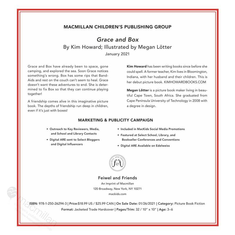 A little girl and a refrigerator box go on many adventures as they imagine all the things they can be in this debut picture book from Kim Howard and Megan Lotter, Grace and Box