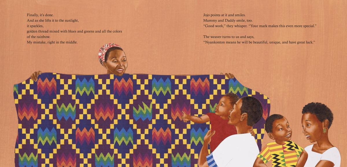 A joyful picturebook of a big brother weaving a Kente cloth for the new baby in his family, with lyrical text and textured artwork that sings.