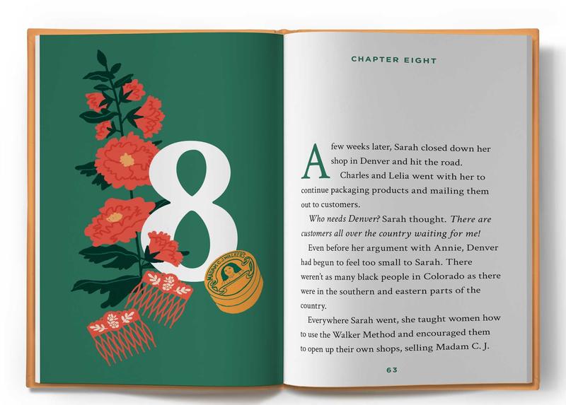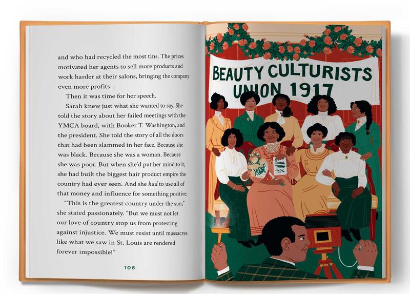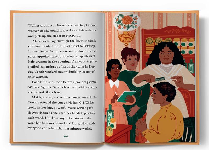 One day, Sarah’s hair starts to fall out! It’s itchy, crunchy, patchy, and won’t grow. Instead of giving up, Sarah searches for the right products. And then she invents something better than any shampoo or hair oil she’s used before. Her hair grows and grows! That’s when she decides to rebrand herself as “Madam C. J. Walker,” and begins her business empire.