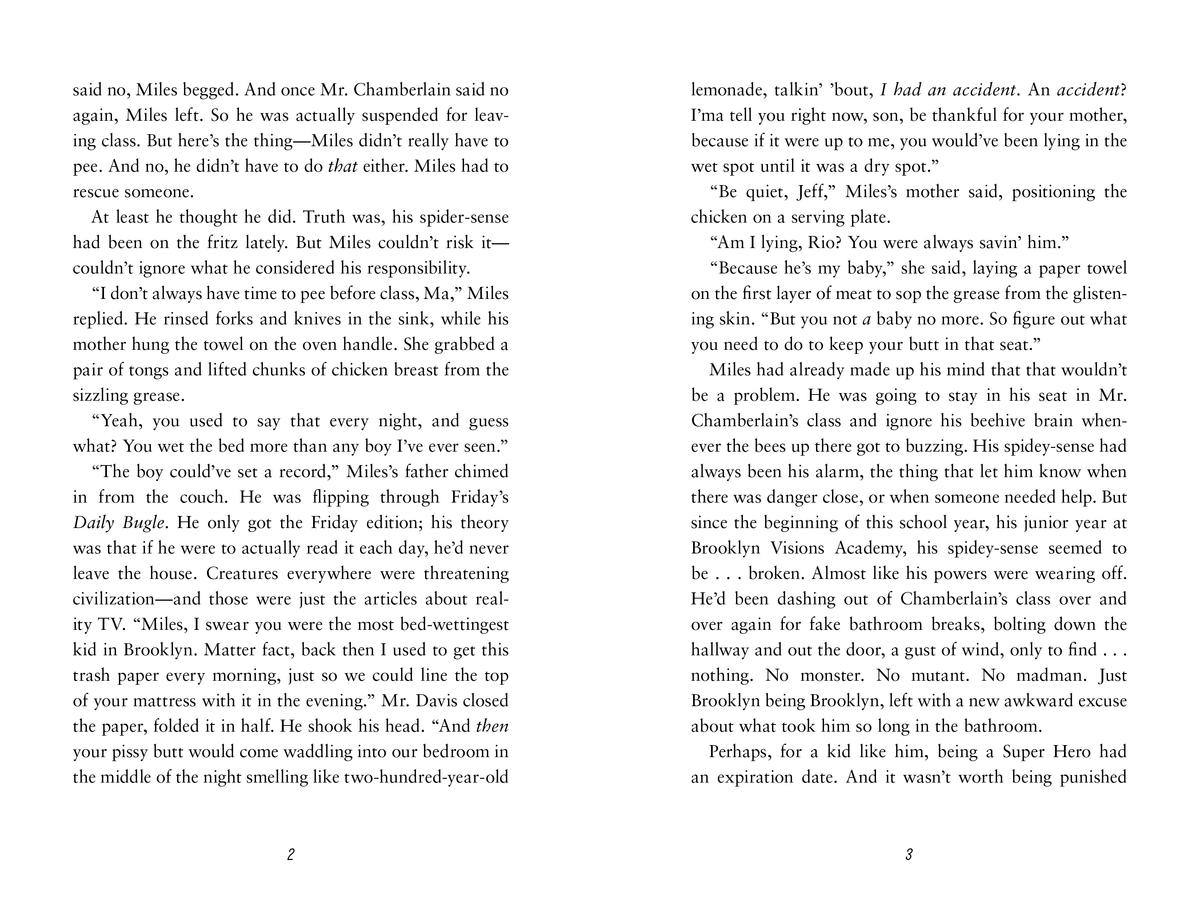 But lately, Miles's spidey-sense has been on the fritz. When a misunderstanding leads to his suspension from school, Miles begins to question his abilities. After all, his dad and uncle were Brooklyn jack-boys with criminal records. Maybe kids like Miles aren't meant to be superheroes. Maybe Miles should take his dad's advice and focus on saving himself.