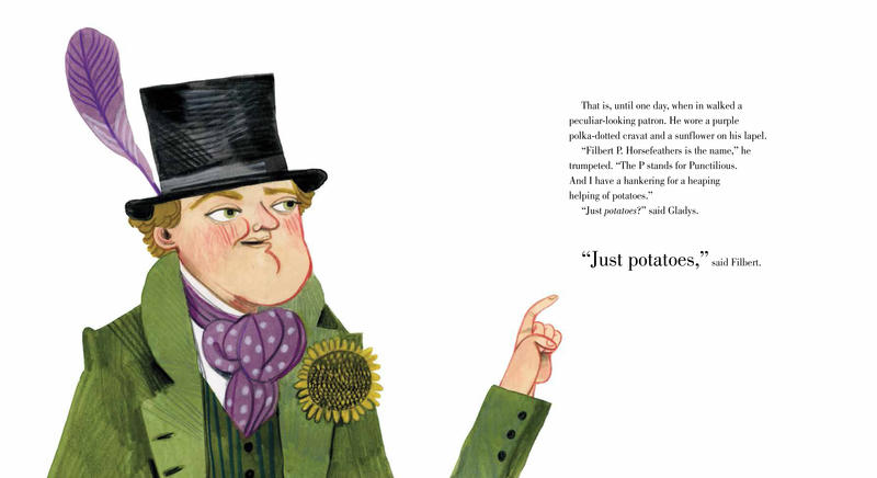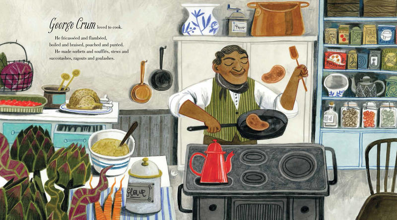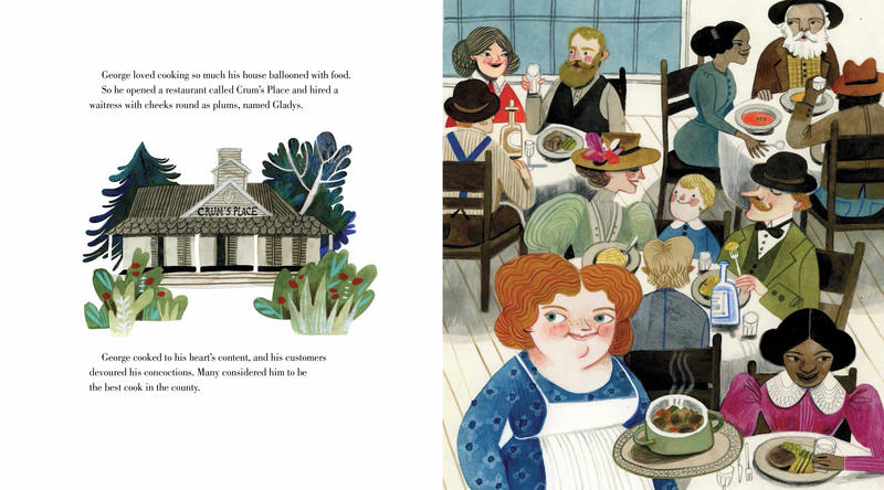 When Filbert P. Horsefeathers walks into George Crum's restaurant, he tells the waitress, “I have a hankering for a heaping helping of potatoes.” Fine cook that he is, George prepares a serving of his most scrumptious, succulent and sublime potato wedges, only to have Filbert send them back. “Too thick,” he says. So, George makes thinner wedges. But his picky customer sends them back again. And again. Feeling a bit mischievous, George decides to use his sharpest knife to cut paper-thin potato slices, which he fries until they are crackling and then showers with salt. At last, Filbert is satisfied, proclaiming, “Perfection!” Which they are. Because, quite by accident, George Crum has invented potato chips! This fictional picture book tale by Anne Renaud is based on a real man named George Crum, a cook in Saratoga Springs, New York, in the 1850s, who is purported to have created the first potato chip in response to a demanding customer. Included at the back of the book is a historical note with a list of sources describing the legend and the remarkable and inspiring story of Crum, a trapper of mixed Native American and African American descent, who supplied restaurants with fresh game, then became a chef and successful restauranteur himself. Felicita Sala's gorgeous illustrations accurately portray the historical period but with a lighthearted touch. They work beautifully with Renaud's playful language and quirky characters for a lively and deliciously fun read-aloud. This book is an excellent choice for lessons on inventions and inventors, history, or why we eat the foods we do.
