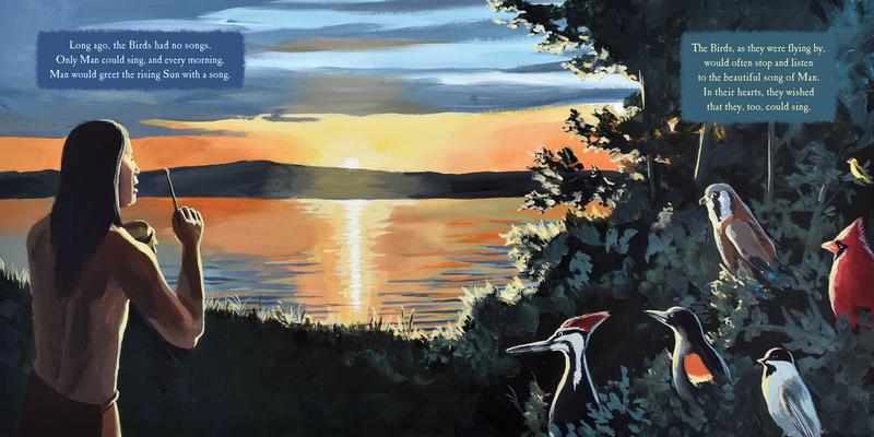 Long ago, when the Birds had no songs, only Man could sing. When the Good Spirit walked the Earth, he noticed a great silence. He realized the Birds had no songs. He devised a great game and told the Birds that whichever one could fly the highest would receive a very beautiful song. But not all the Birds were honest. In his desire to win the game, the small Hermit Thrush jumped on the back of the great Eagle. The Eagle flew higher than any of the Birds, but when he came back to land, the Good Spirit said the Hermit Thrush had gone the highest, since he was on the Eagle's back. Hermit Thrush was awarded a beautiful song, but in his shame of not being honest, he flew into the deep woods. To this day, you may hear the lovely song of the Hermit Thrush, but you may not ever see him.