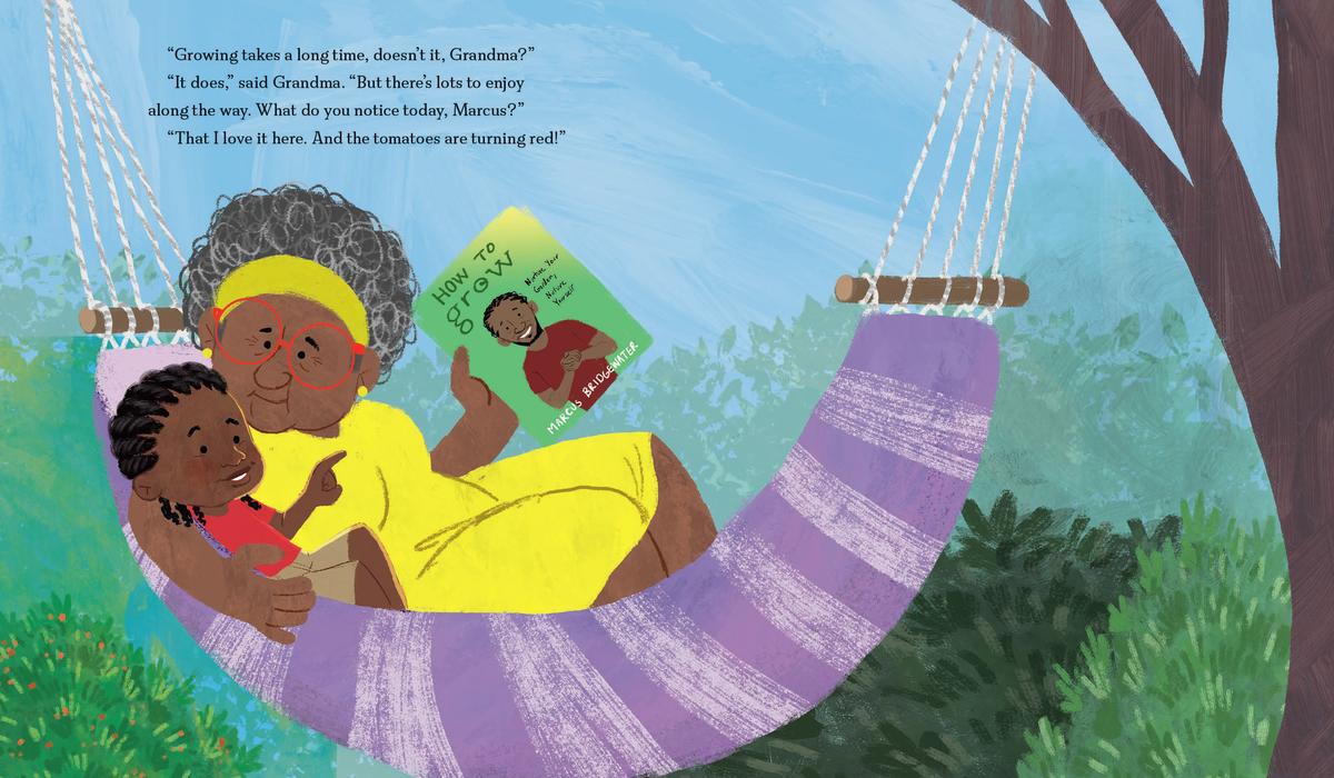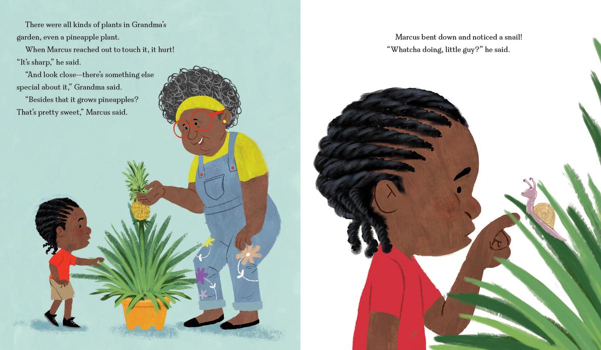Grandma's favorite place is her garden. It seems like she could stay there forever! Marcus wants to know why--so they set about exploring it together. From shells protecting seeds (like Marcus's helmet protects his head!) to a small seed eventually growing into something big (also just like Marcus!), there are so many amazing connections to be made in this wonderful place. Day after day, Marcus delights in realizing how much he has in common with the plants--he drinks water every day, too, and he gets haircuts just like the plants get pruned. As his grandma says, there's a whole world to explore in a garden, and Marcus likes thinking about it as a playground for all the snails, birds, bugs, and worms. And one of its many beauties is the bounty they are rewarded with after all the love and care they pour into it!