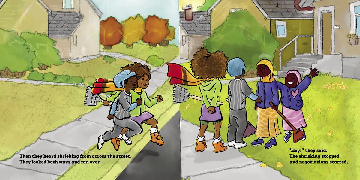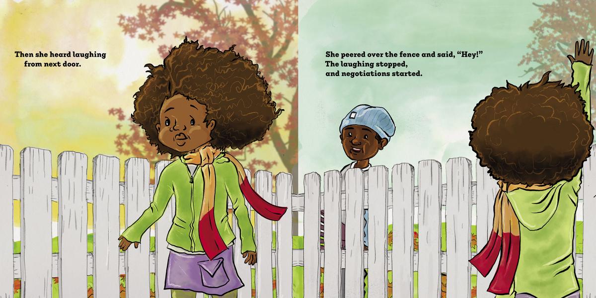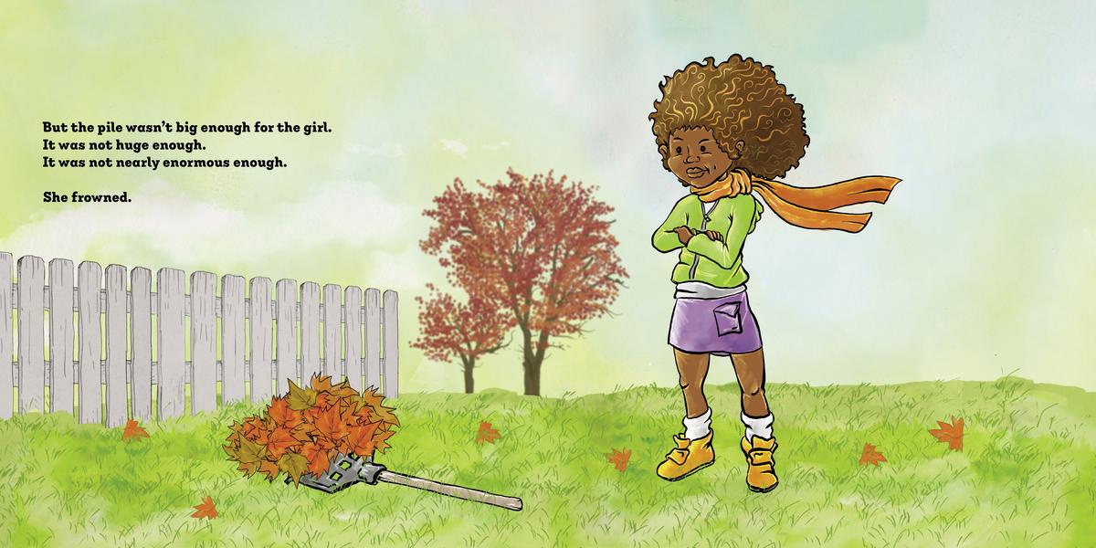 The girl wants a leaf pile to leap in. A big leaf pile, a huge leaf pile, an enormously enormous leaf pile! She rakes and rakes and rakes, but there are not enough leaves in her yard to make the leaf pile of her dreams. And she can’t do it alone. She will need some help.