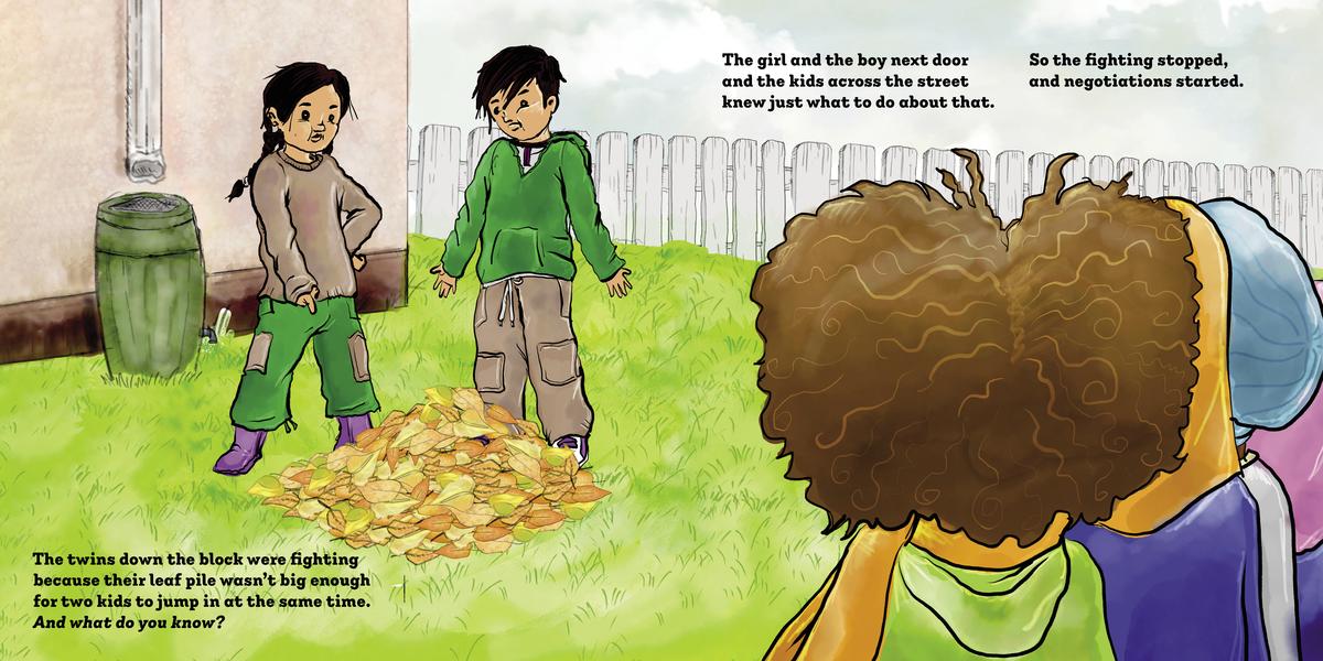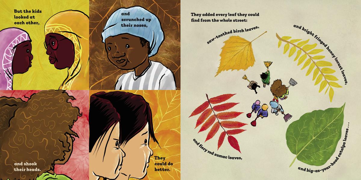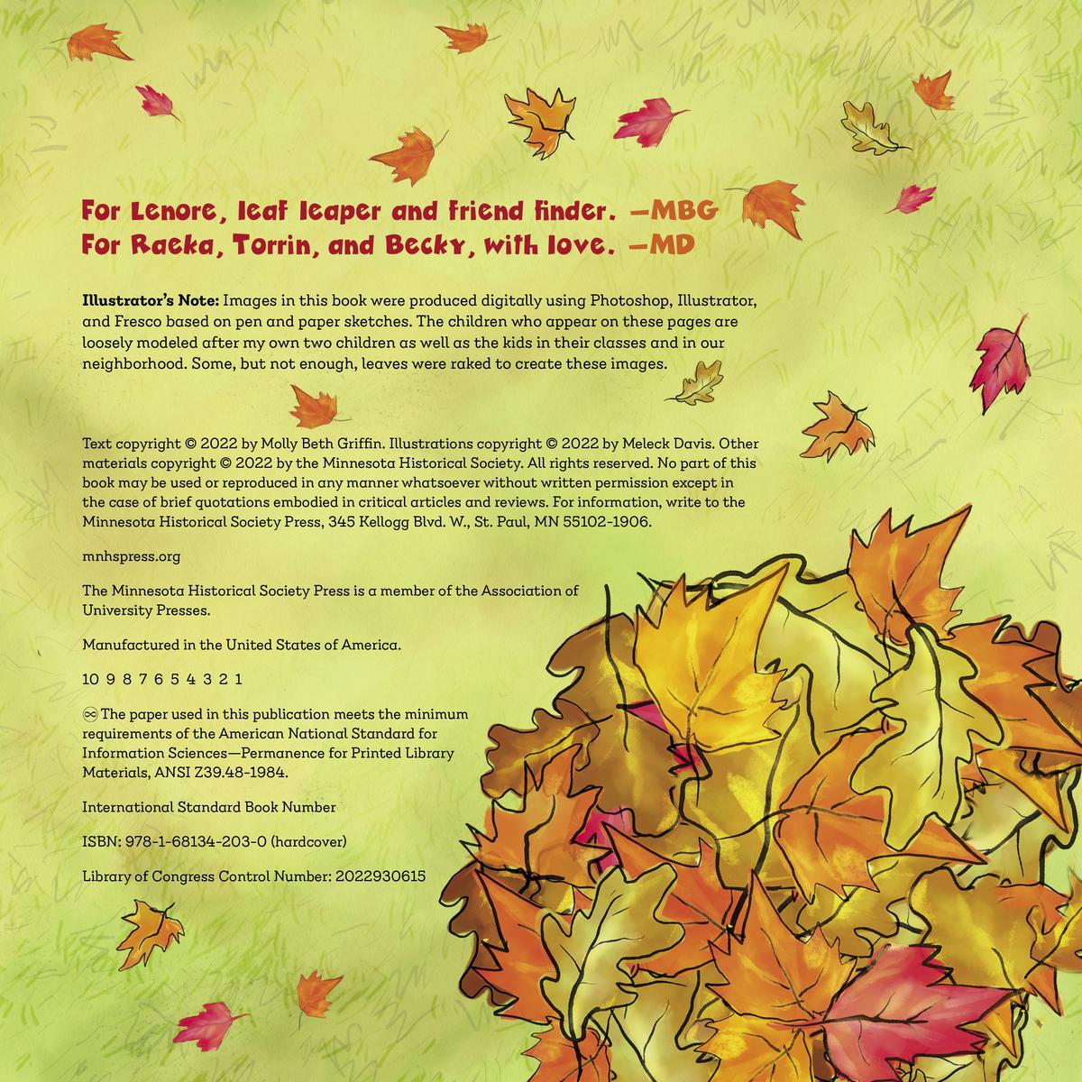 , playful phrasing evokes fall’s crisp air, warm sun, and rustling leaves. Energetic illustrations—with characters based on the illustrator's own neighborhood kids—depict the satisfying effort of new friends working together to create something wonderful. A deep, soft, crunchy, springy leaf pile. A tall, wide leaf pile. A big, huge, enormously enormous leaf pile! And when all the work is done, it's time to play. To count down together. To leap.