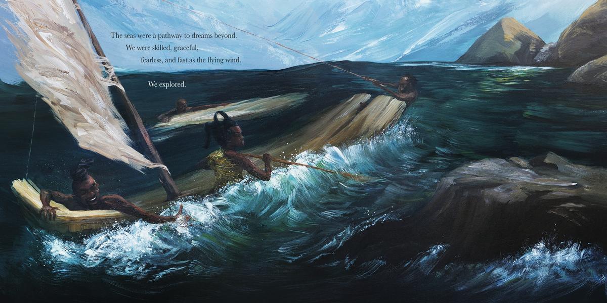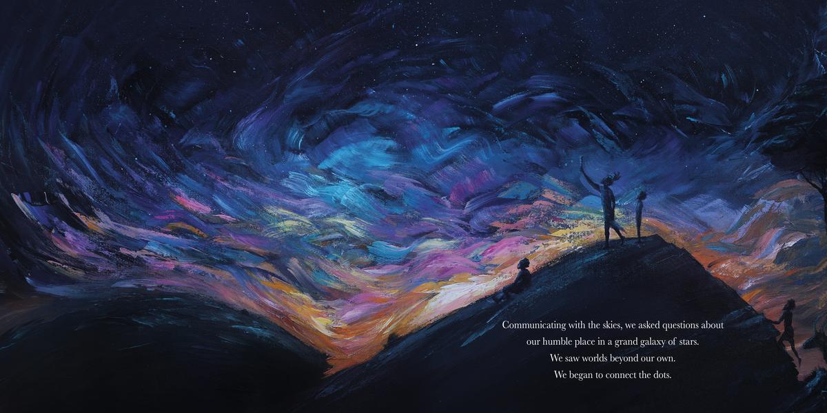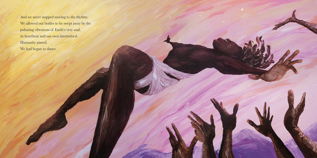 takes what we know about modern human civilization and, through magnificent paintings, creates a tale about our shared beginnings in a way that centers Black people in humankind's origin story.