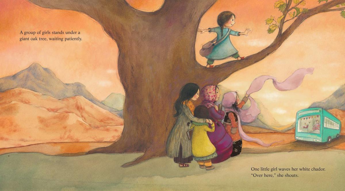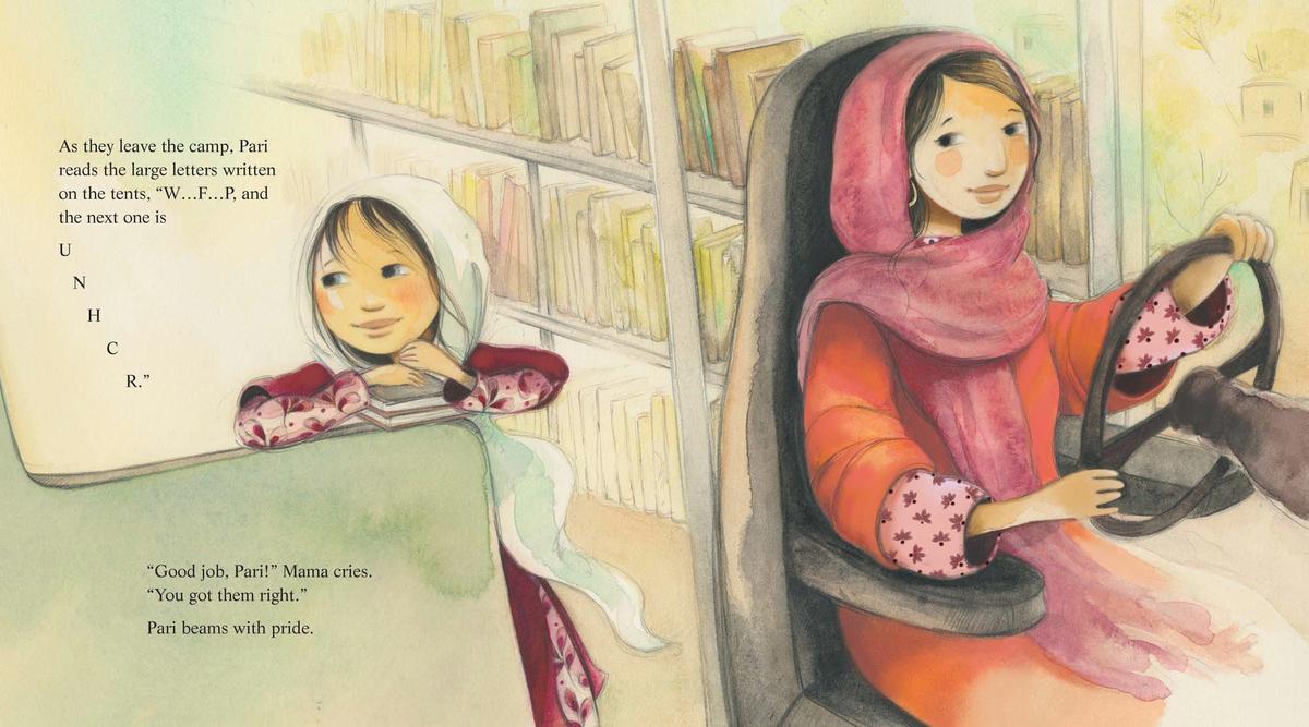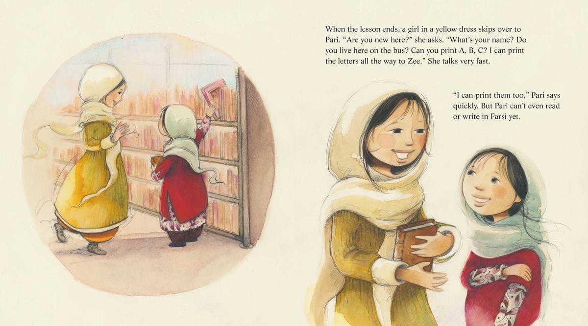 It is still dark in Kabul, Afghanistan when the library bus rumbles out of the city. There are no bus seats-instead there are chairs and tables and shelves of books. And there are no passengers-instead there is Pari, who is nervously starting her first day as Mama's library helper. Pari stands tall to hand out notebooks and pencils at the villages and the refugee camp, but she feels intimidated. The girls they visit are learning to write English from Mama. Pari can't even read or write in Farsi yet. But next year she will go to school and learn all there is to know. And she is so lucky. Not long ago, Mama tells her, girls were not allowed to read at all.