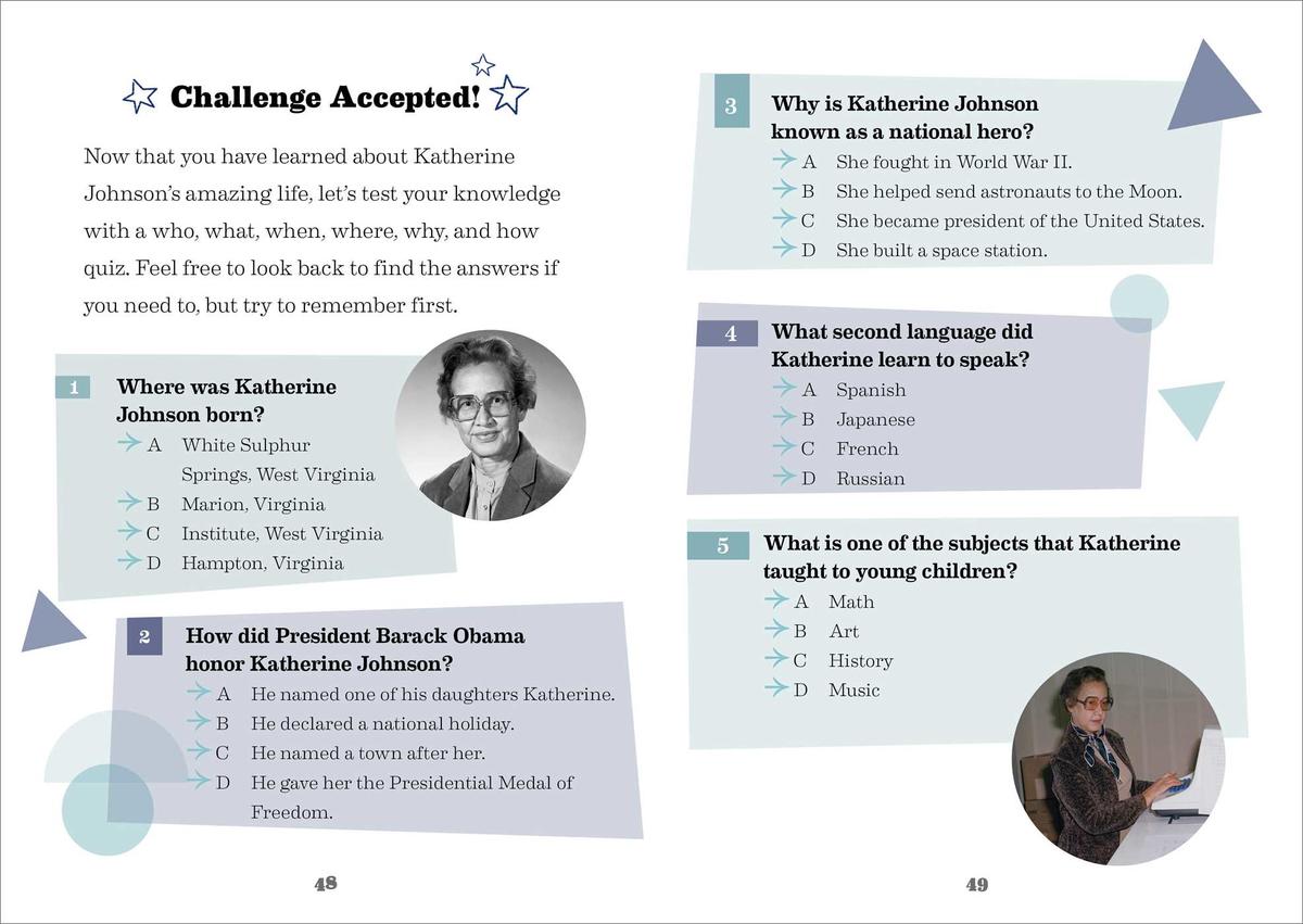 - Critical thinking—Kids will learn the Who, What, Where, When, Why, and How of Katherine's life, find definitions of new words, discussion questions, and more.