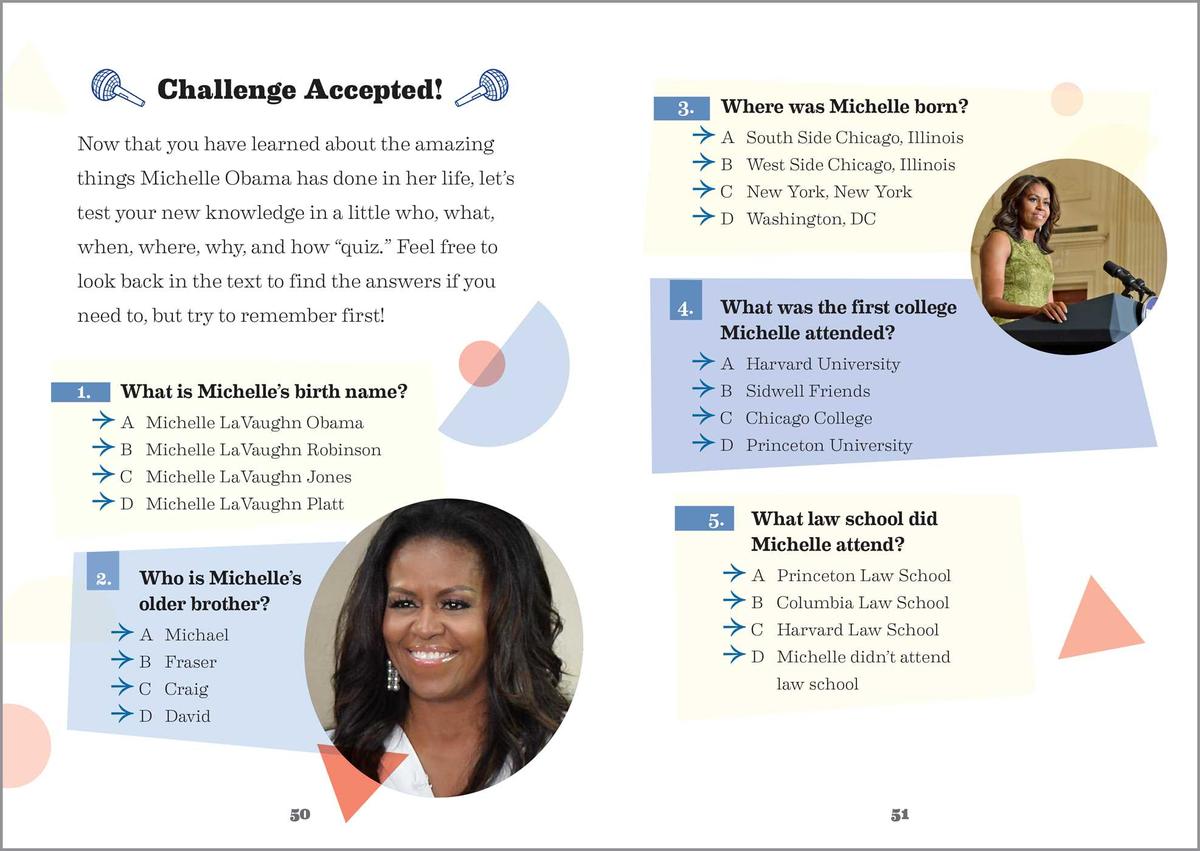 - Critical thinking—Kids will learn the Who, What, Where, When, Why, and How of Michelle's life, find definitions of new words, discussion questions, and more.