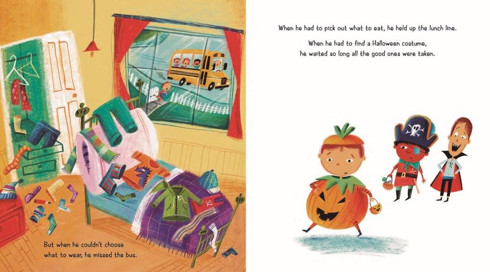Alexander can’t decide on a Halloween costume, so he winds up as a pumpkin; he can’t decide what to wear to school, so he misses the bus; he can’t decide what school lunch to eat, so he winds up with tuna casserole.