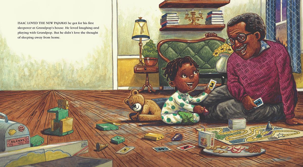 Isaac is excited about having a sleepover at Grandpop’s house, but he’s a little nervous about being away from home for the first time. Luckily, his knowing Grandpop tells him it’s not quite time to go to bed yet—first, he needs Isaac’s help in putting the