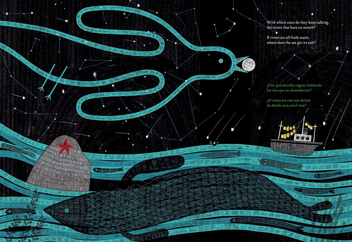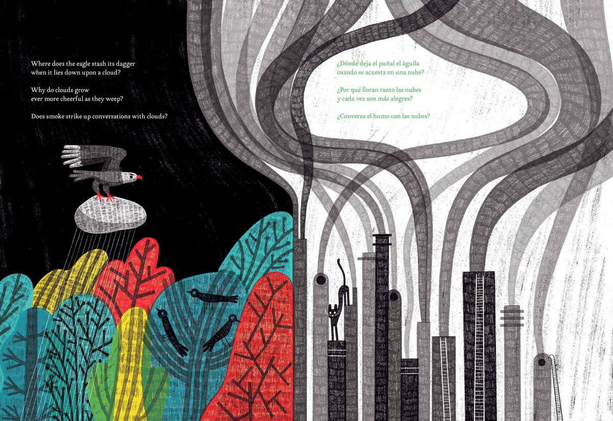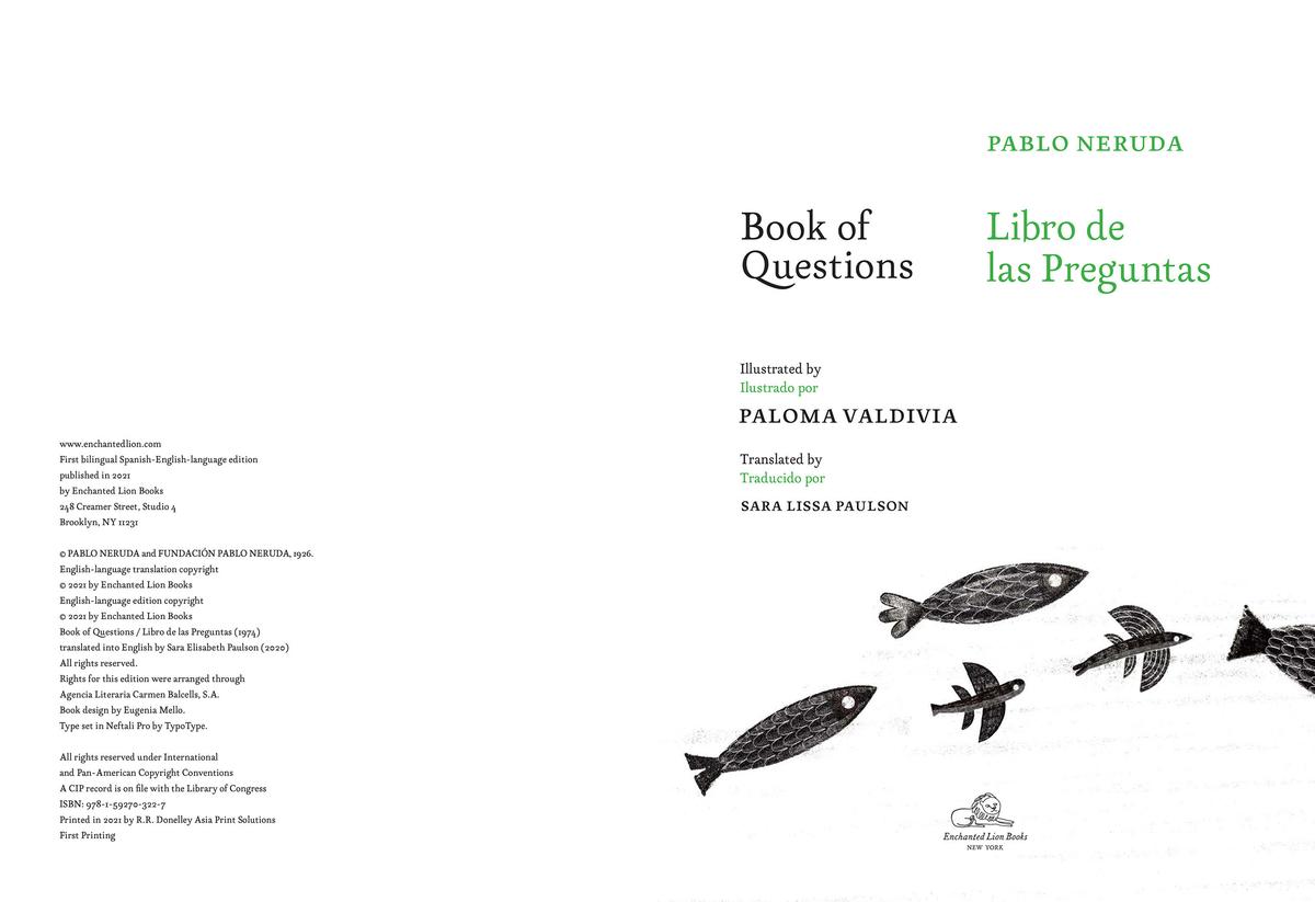 Gorgeously, cosmically illustrated by Paloma Valdivia, here Neruda's questions, already visual in themselves, gain a double visuality that makes them even more palpable and resonant. So clearly rooted in Chilean landscapes as they are, the questions are revealed as a communion with nature and its mysteries.