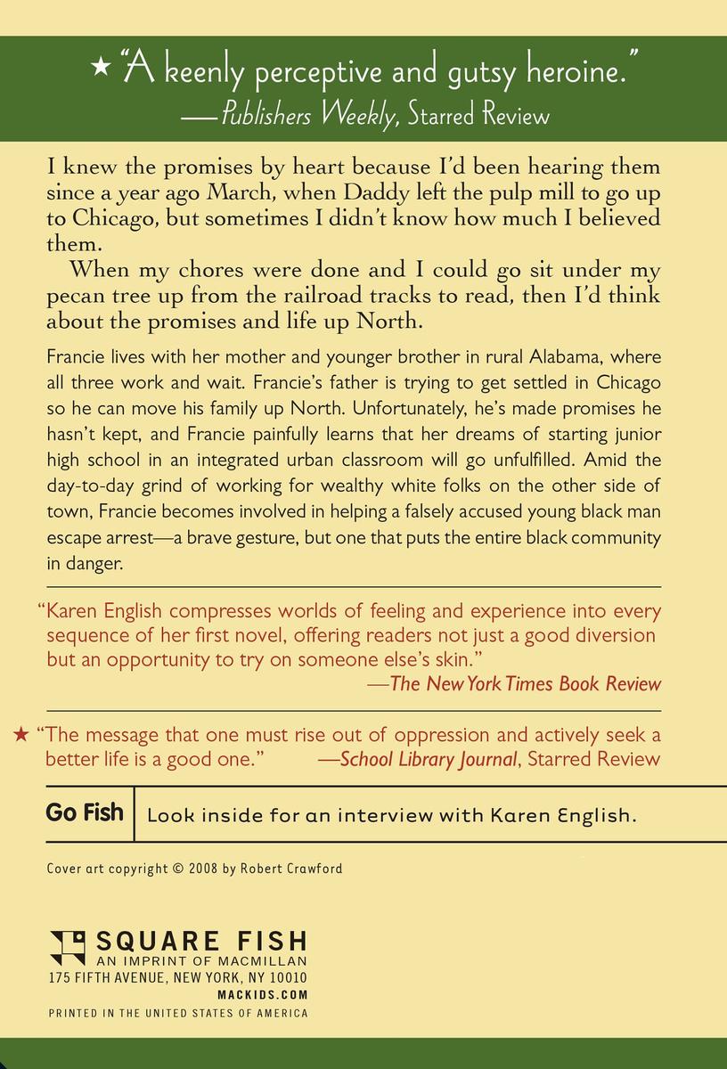 Francie lives with her mother and younger brother, Prez, in rural Alabama, where all three work and wait. Francie's father is trying to get settled in Chicago so he can move his family up North. Unfortunately, he's made promises he hasn't kept, and Francie painfully learns that her dreams of starting junior high school in an integrated urban classroom will go unfulfilled. Amid the day-to-day grind of working odd jobs for wealthy white folks on the other side of town, Francie becomes involved in helping a framed young black man to escape arrest—a brave gesture, but one that puts the entire black community in danger. In this vivid portrait of a girl in the pre-civil rights era South, Karen English completes Francie's world using lively vernacular and a wide array of flesh-and-blood characters.