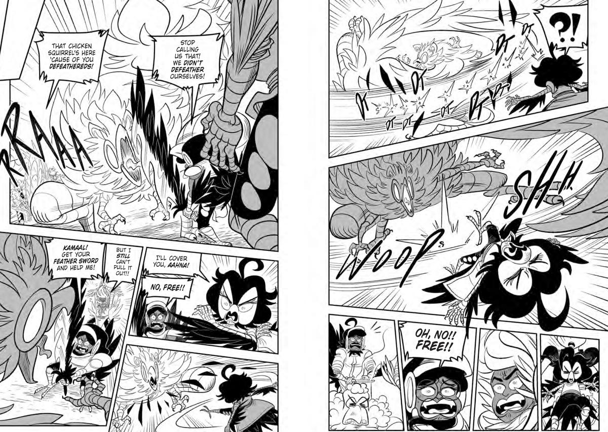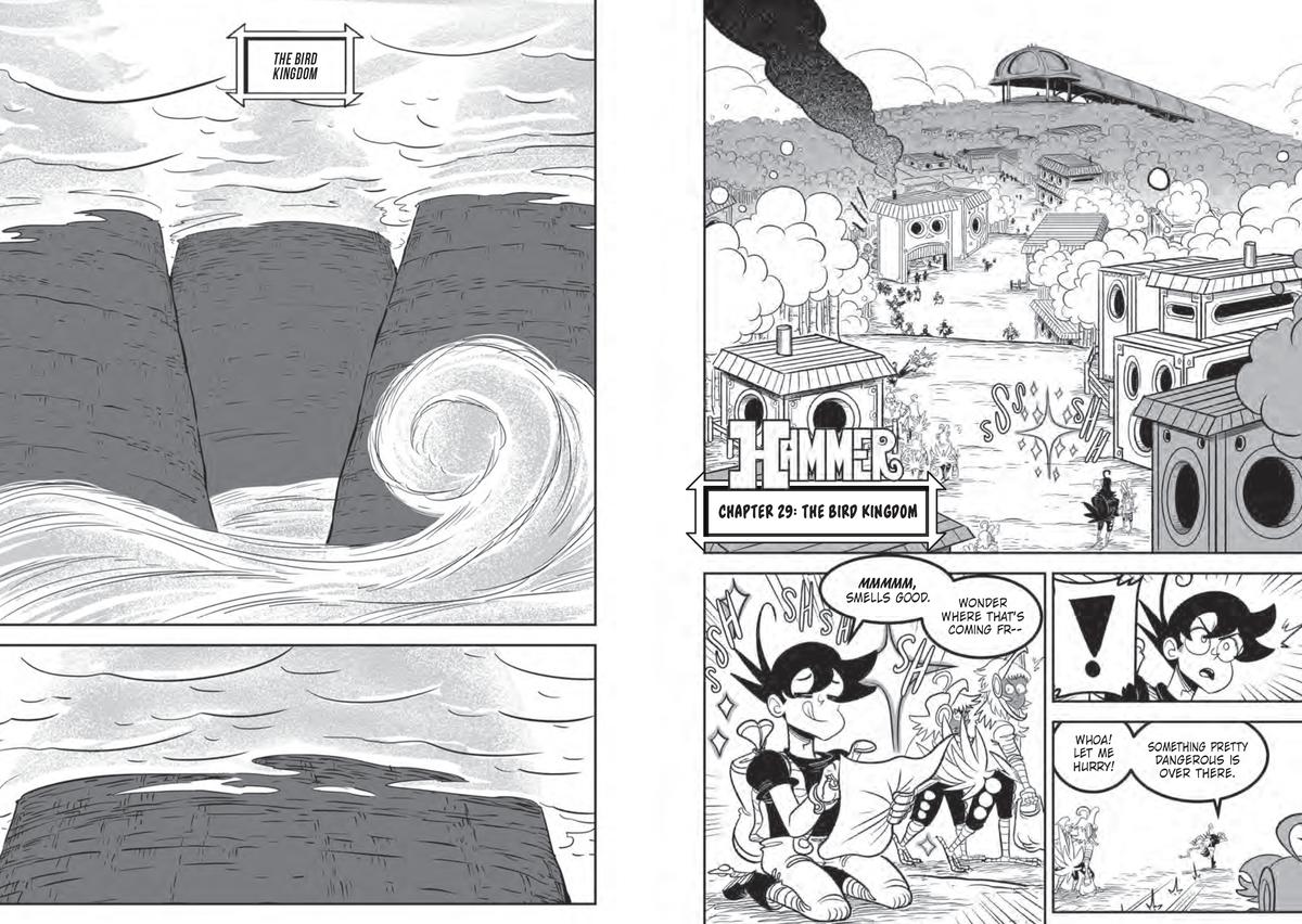 In Hammer, Volume 5, while uncovering clues to his father’s current location, Stud struggles against the Bird Kingdom, a prejudiced society where open-beaked birds with human faces are mocked and called “defeathered” by closed-beaked birds (who refer to themselves as “true birds”). Kamaal, an open-beaked bird, decides to help Stud get another kingdom map so he can potentially get home. Unfortunately, in the heart of the Bird Kingdom, where the new map is, the law strictly prohibits human-faced birds and humans from roaming around freely. When King Crow catches Kamaal and Stud, they are sentenced to death. Stud’s going to need all his power to stand up for what’s right and take down a segregated society—and survive his death sentence.