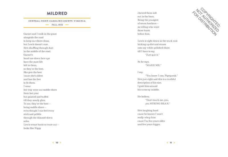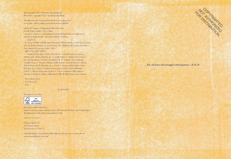 From acclaimed author Patricia Hruby Powell comes the story of a landmark civil rights case, told in spare and gorgeous verse. In 1955, in Caroline County, Virginia, amidst segregation and prejudice, injustice and cruelty, two teenagers fell in love. Their life together broke the law, but their determination would change it. Richard and Mildred Loving were at the heart of a Supreme Court case that legalized marriage between races, and a story of the devoted couple who faced discrimination, fought it, and won.