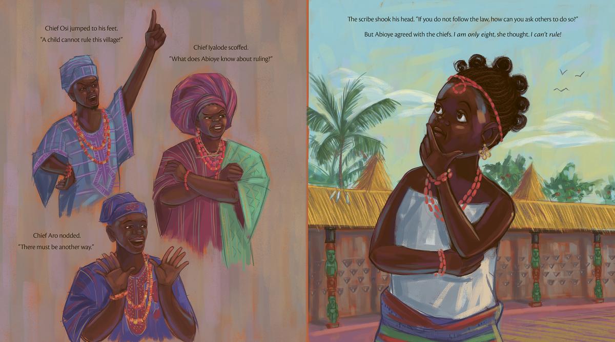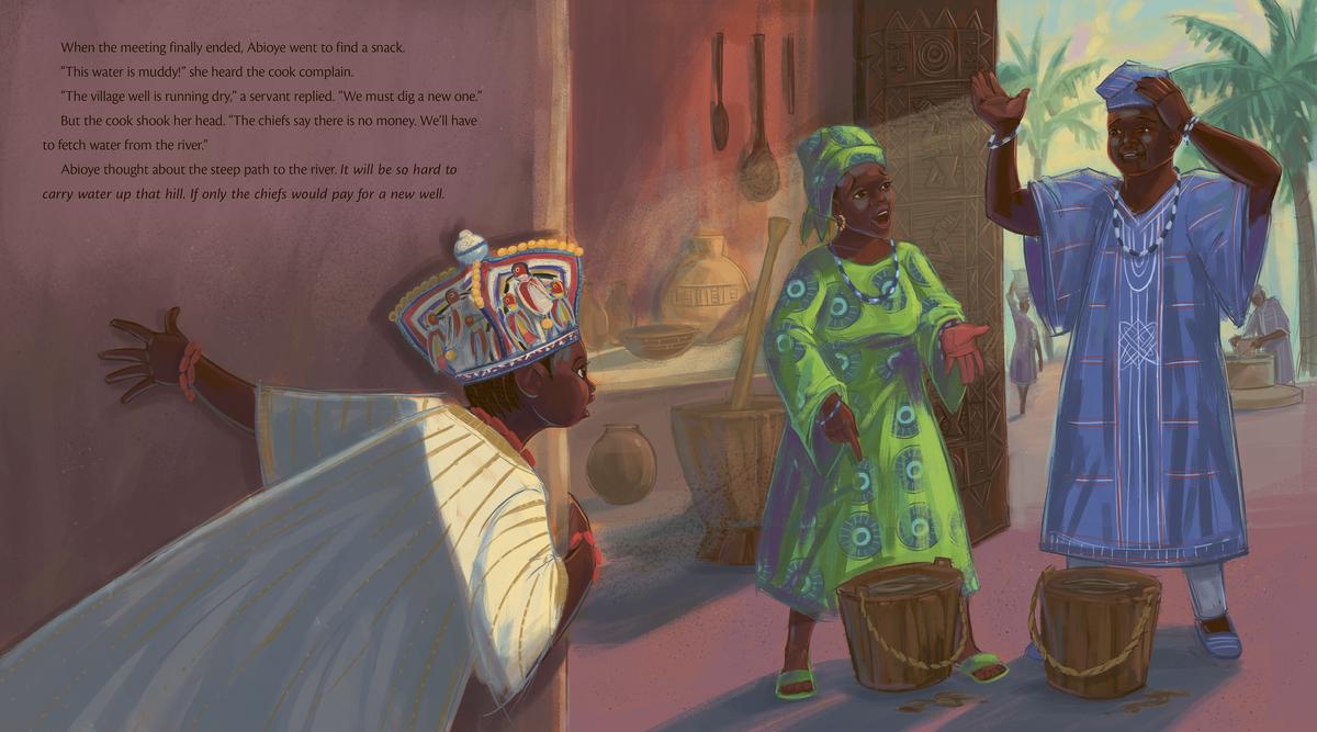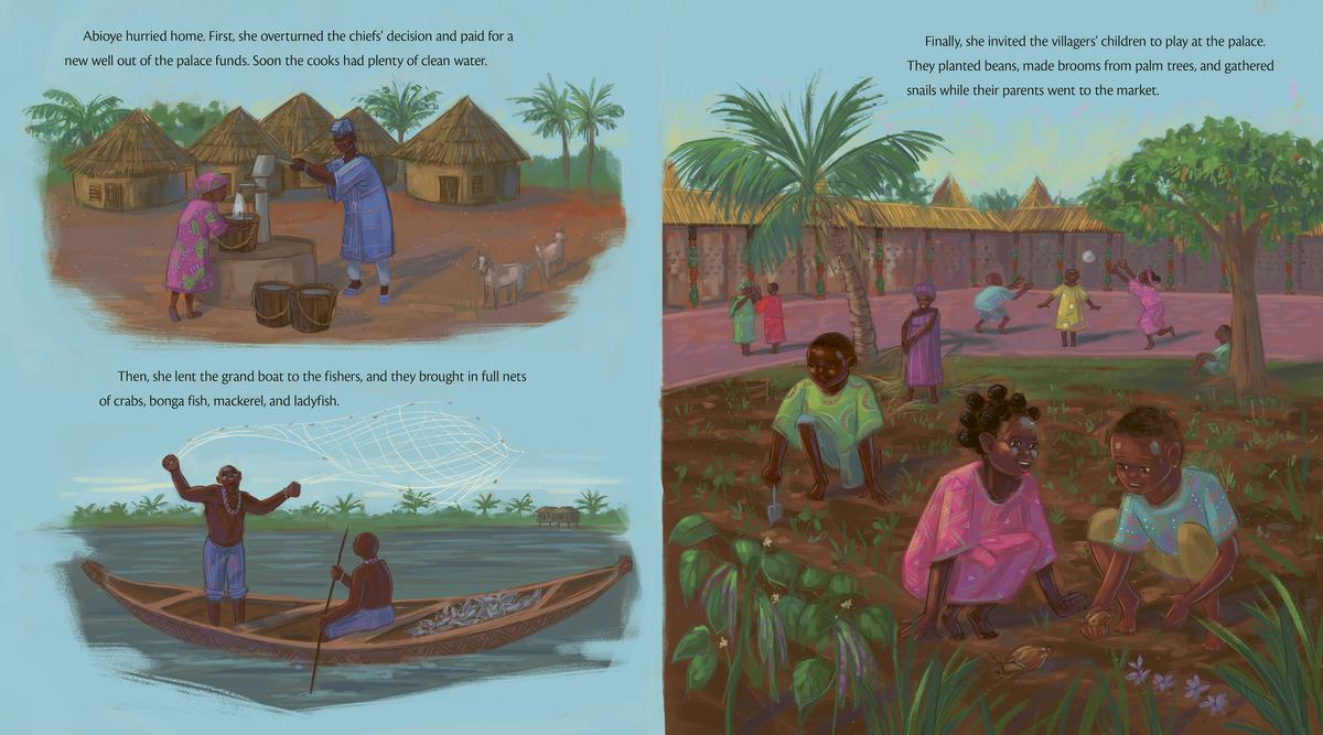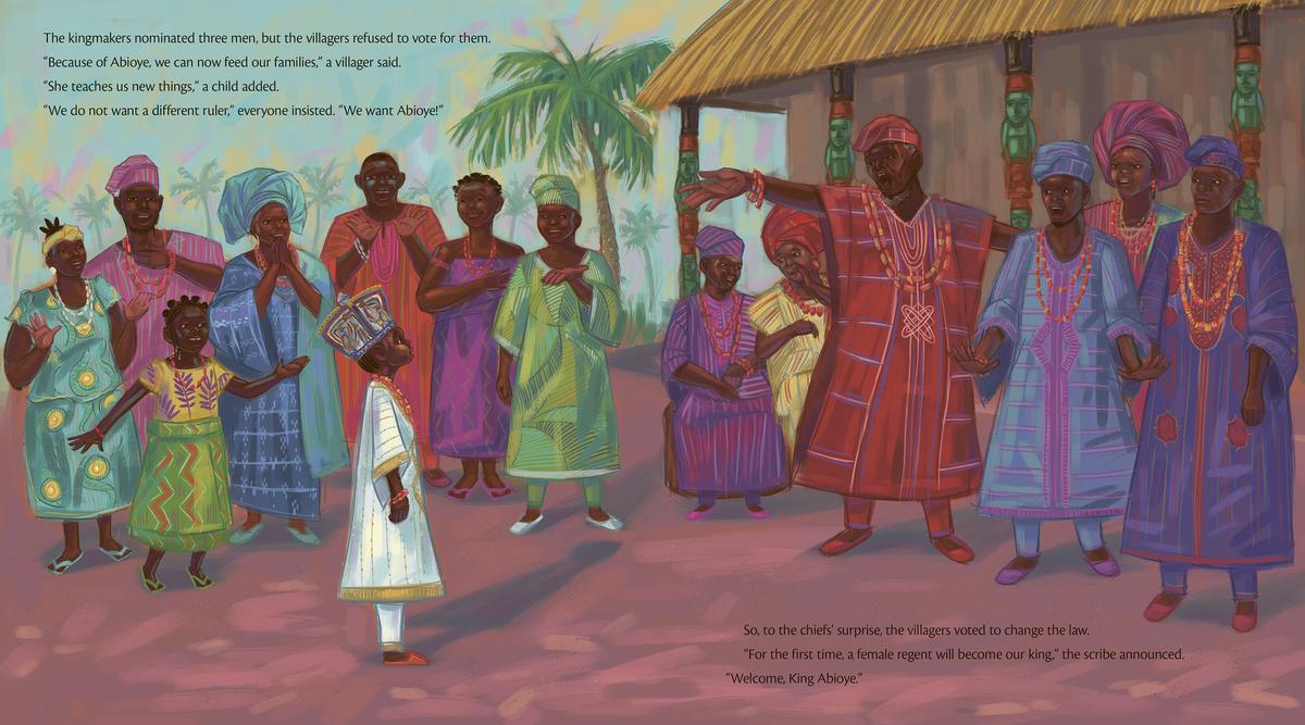 The next day, amid meetings about taxes and titles, Abioye keeps her eyes and ears open for ways to serve her people. When she hears about their dried-up well, their leaky boats, and their hungry children, she decides to devote herself to helping the villagers instead of attending stuffy meetings with the chiefs. With her ideas and support, the village flourishes. But as the villagers praise her leadership, the chiefs complain that she is abandoning her duties, and announce that it's time for a new king. When the time comes for the villagers to vote for their new ruler, they reject all the other candidates and crown Abioye instead, making her the first female king the village has ever had!
