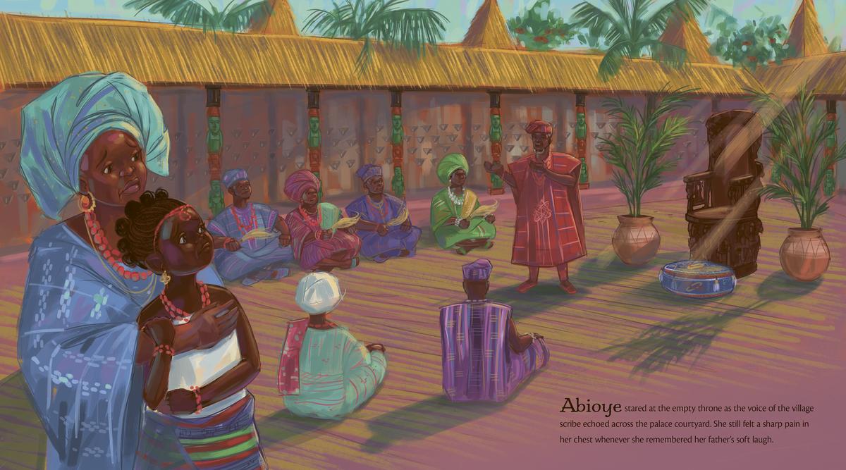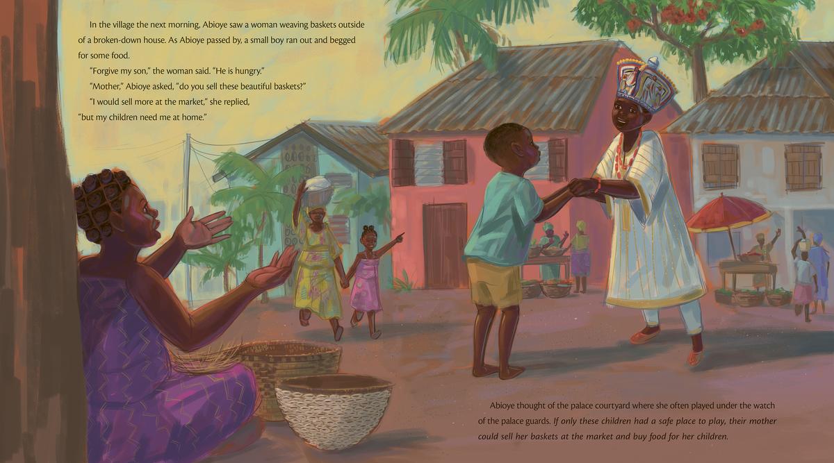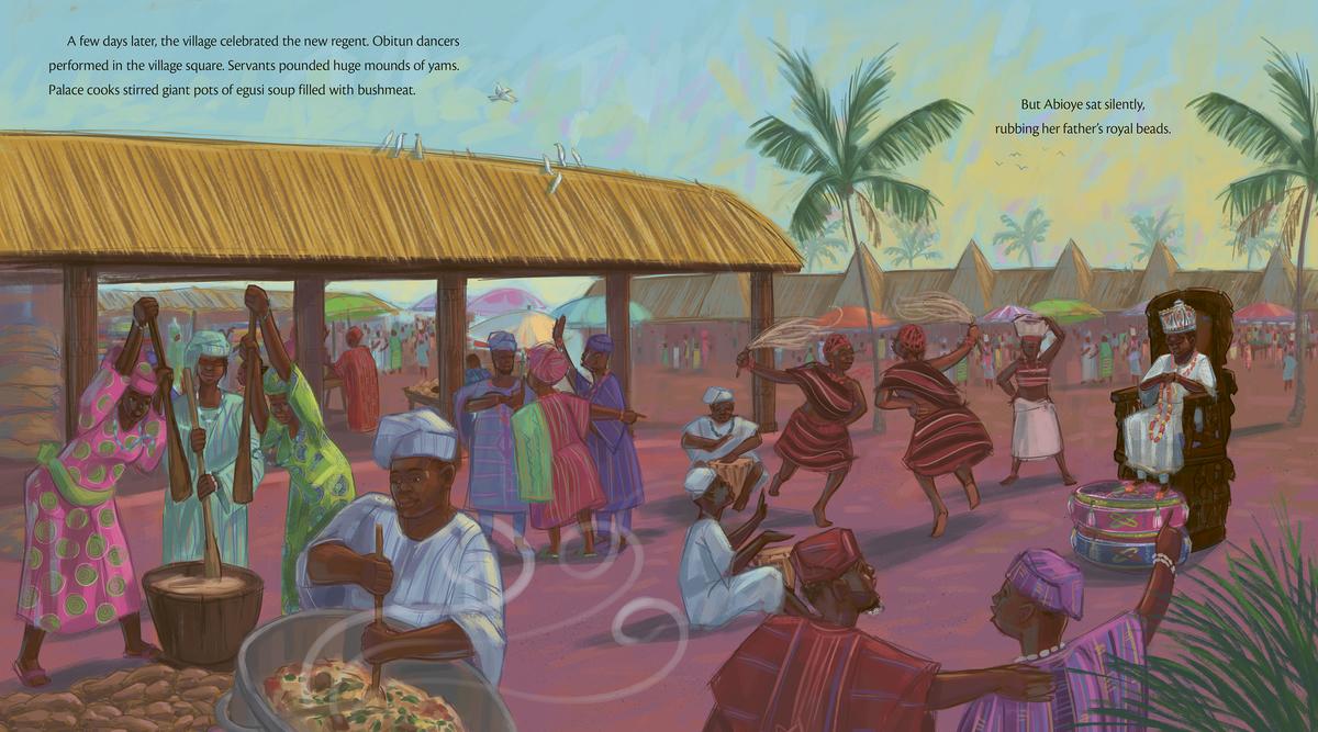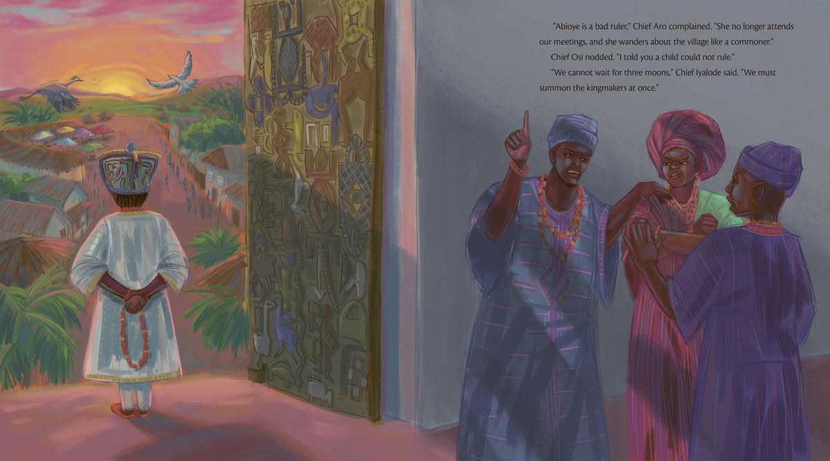 The next day, amid meetings about taxes and titles, Abioye keeps her eyes and ears open for ways to serve her people. When she hears about their dried-up well, their leaky boats, and their hungry children, she decides to devote herself to helping the villagers instead of attending stuffy meetings with the chiefs. With her ideas and support, the village flourishes. But as the villagers praise her leadership, the chiefs complain that she is abandoning her duties, and announce that it's time for a new king. When the time comes for the villagers to vote for their new ruler, they reject all the other candidates and crown Abioye instead, making her the first female king the village has ever had!