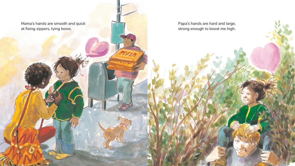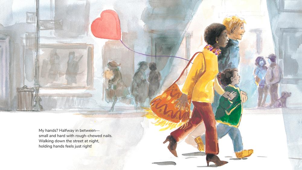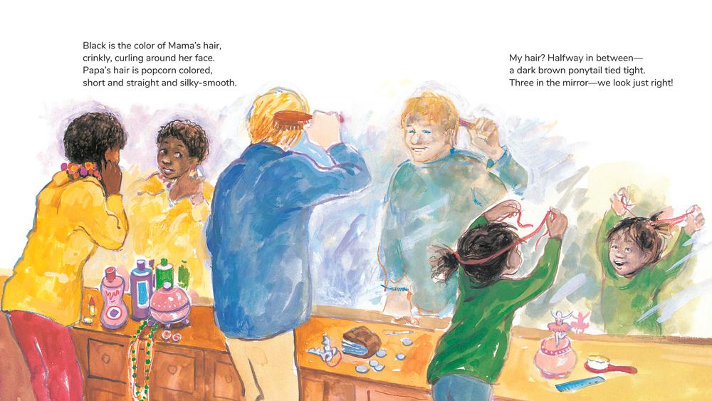 As this little family moves through the world, the girl notes some of the ways that her parents are different from each other, and how she is different from both of them. With each difference she lists, she highlights the ways that their individual characteristics join together to make her family. The fact that her mother is African American and her father is white is just one of the many interesting things that make this little girl and her family "just right."