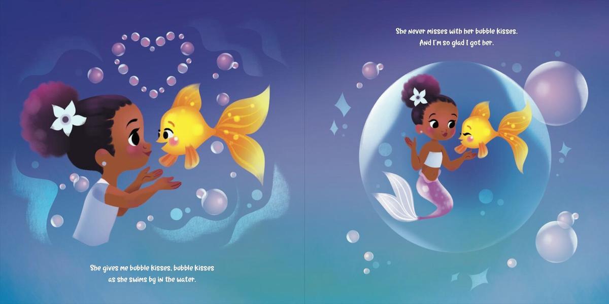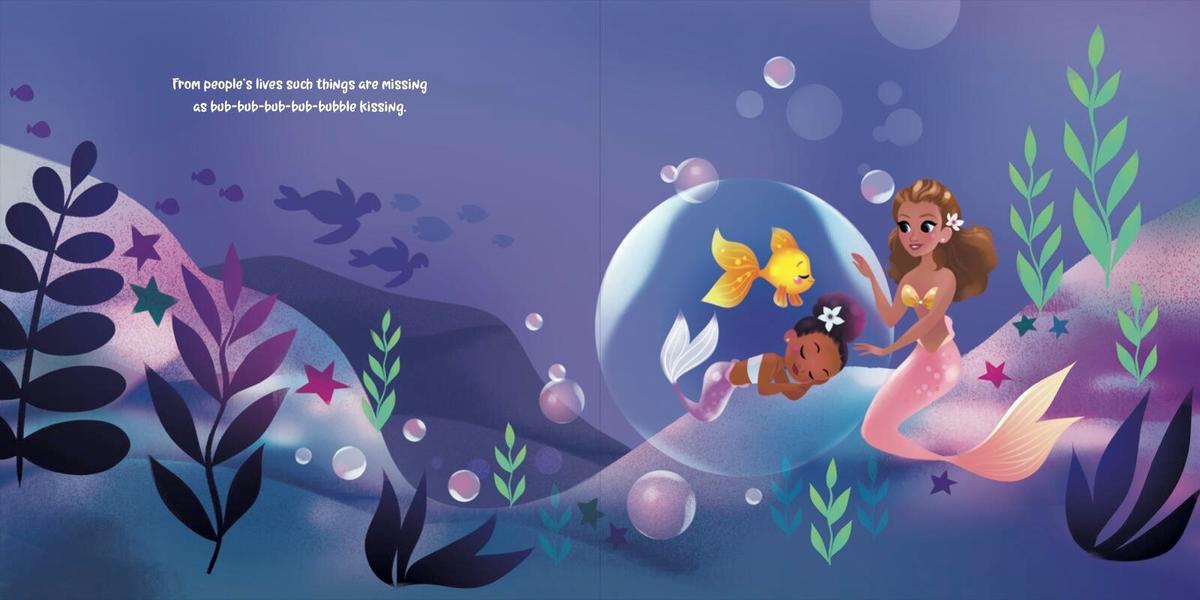 give bubble kisses that transform the girl into a mermaid and transport her to a world of underwater adventures. There, beneath the sea, they play, sing, and dance with other mermaids. The catchy, breezy, rhymed tale is perfect for bedtime, and the book includes a free digital download and CD of the song.
