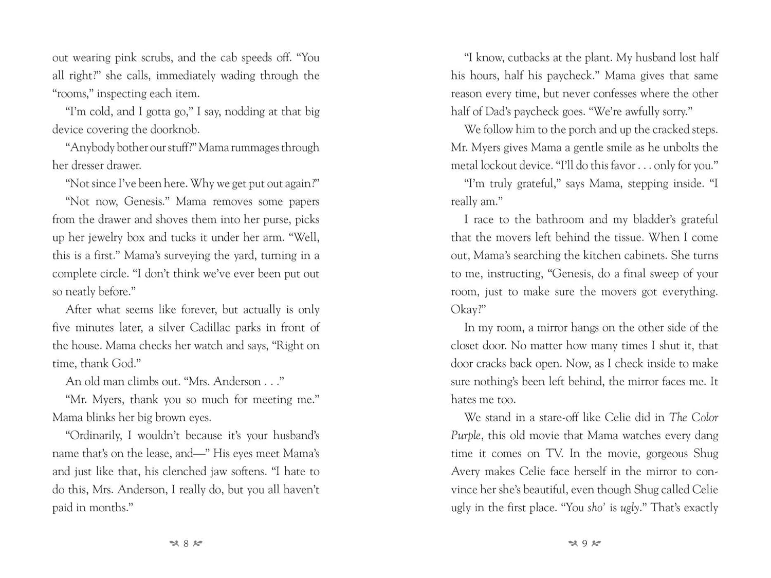 There are ninety-six things Genesis hates about herself. She knows the exact number because she keeps a list. Like #95: Because her skin is so dark, people call her charcoal and eggplant—even her own family. And #61: Because her family is always being put out of their house, belongings laid out on the sidewalk for the world to see. When your dad is a gambling addict and loses the rent money every month, eviction is a regular occurrence.
