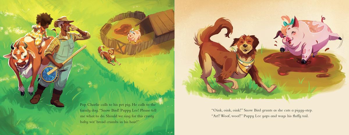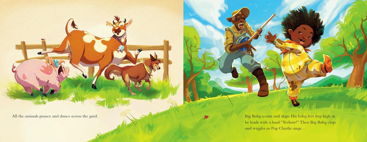Hezekiah Big Baby Jenkins runs from the breakfast table to the farmyard begging Pop Charlie to sing. As he plucks his diddley bow, Pop Charlie smiles and invites the animals and Big Baby to join in the music.