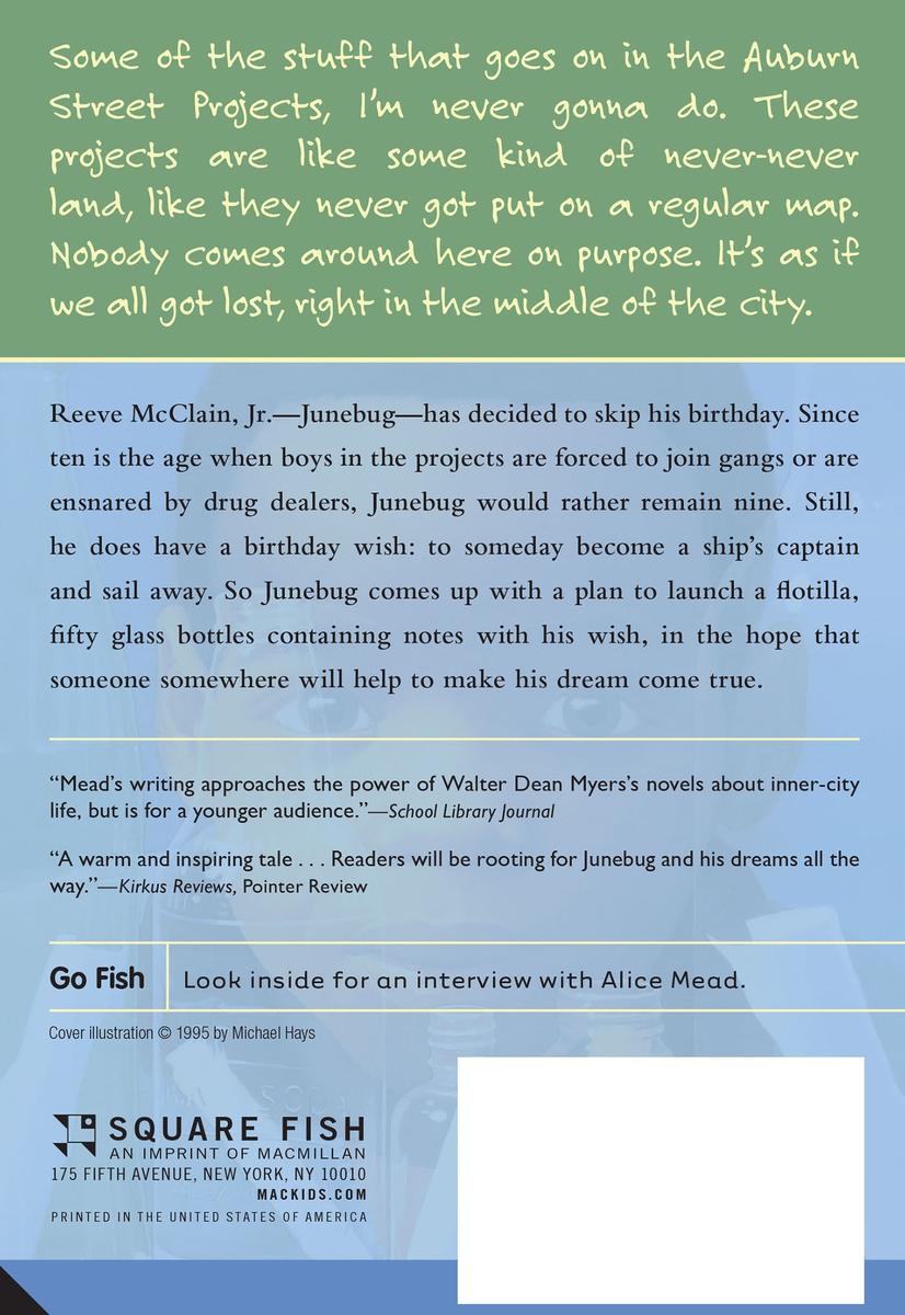 Reeve McClain, Jr. -- Junebug -- has decided to skip his birthday. Since ten is the age when boys in the projects are forced to join gangs or are ensnared by drug dealers, Junebug would rather remain nine. Still, he does have a birthday wish: to someday become a ship's captain and sail away. So Junebug comes up with a plan to launch a flotilla, fifty glass bottles containing notes with his wish, in the hope that someone somewhere will help to make his dream come true.