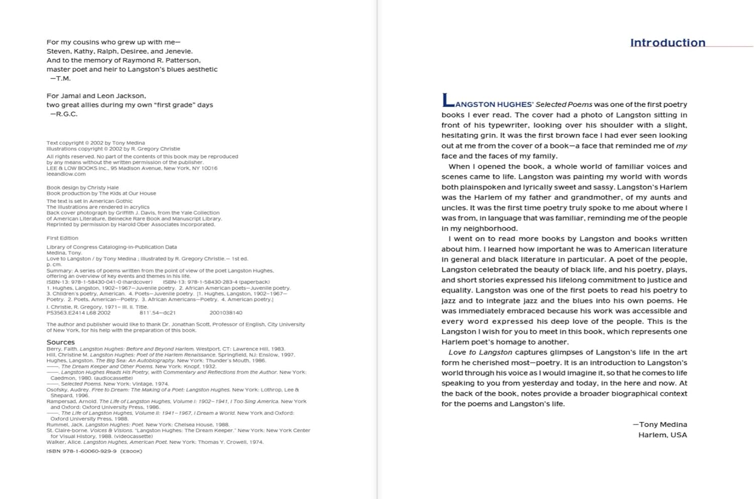 Fourteen original poems offer young readers an exciting glimpse into the life of Langston Hughes, one of America's most beloved poets. Each of Medina's engaging poems explores an important theme in Hughes' life — his lonely childhood, his love of language and travel, his dream of writing poetry. Extensive notes at the back of the book expand upon the poems, giving a broader picture of Hughes' life and the time in which he lived. With stunning illustrations by R. Gregory Christie, Love To Langston brings Langston Hughes to life for a new generation of readers.