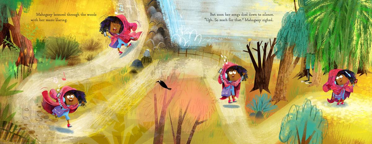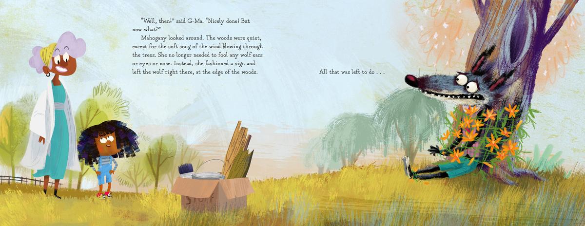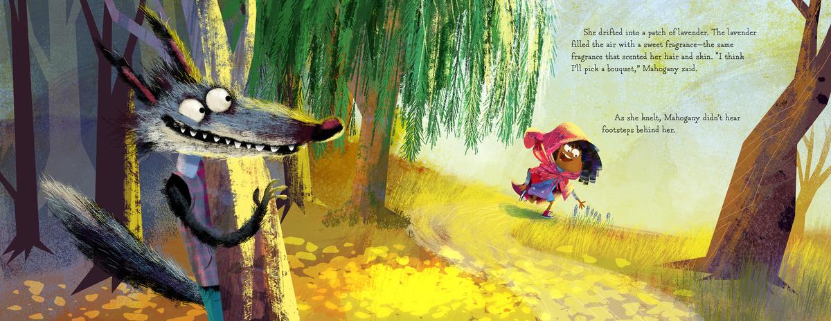 Mahogany is a spunky girl who loves to sew, listen to music, and wear fresh kicks. On the way to deliver homemade honey cornbread to Grandma's house, she encounters a hungry wolf. Because Mahogany is clever, she stands by a willow tree, where her long, black curly hair blends with the branches. She hides in the forest, where her ebony skin merges with the shadows. And Mahogany knows the lavender scent of her skin will mix with the smells of flowering plants, tricking any wolf nose.