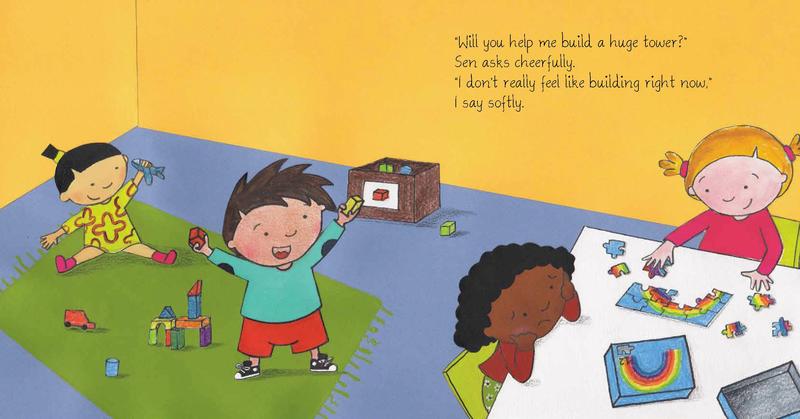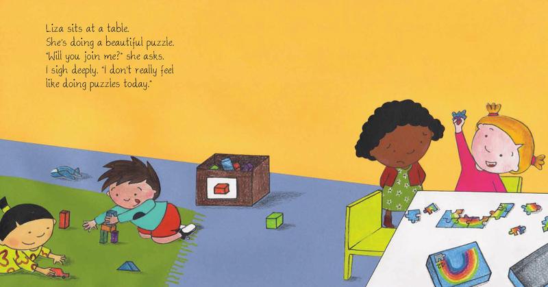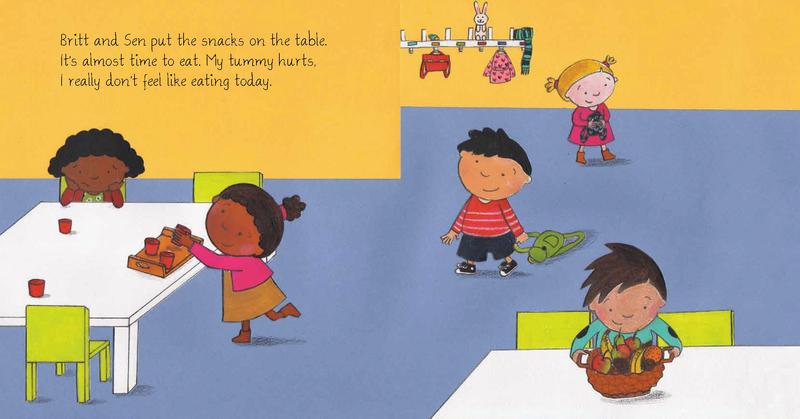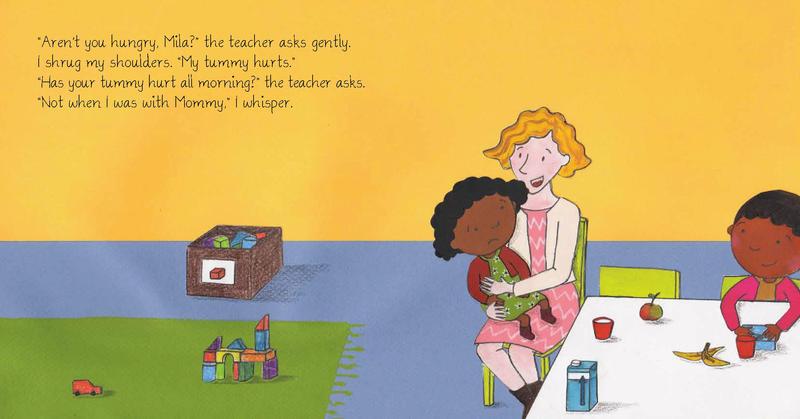 Mila has a tummy ache. She's at school but she doesn't really want to participate or play with the other kids in class. She doesn't feel like playing with puzzles or blocks. She doesn't even feel like eating snacks. Her teacher knows just what it is: "I think you miss your mommy, Mila." Luckily, Mila's friends, Sen and Liza, are there to cheer her up. With their help, Mila finds that she doesn't miss her mommy as much anymore.