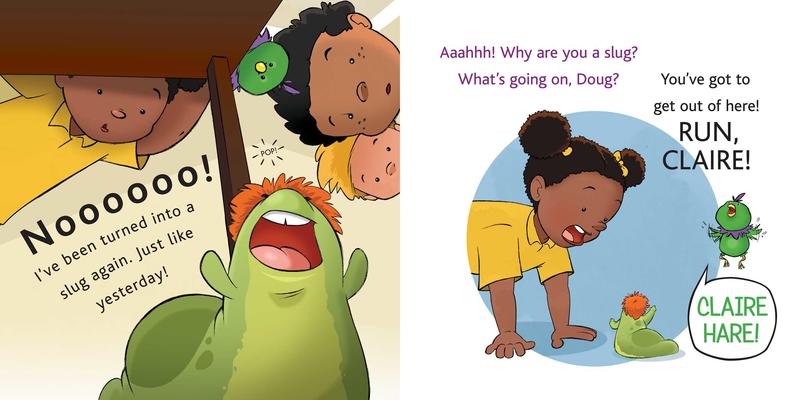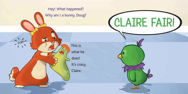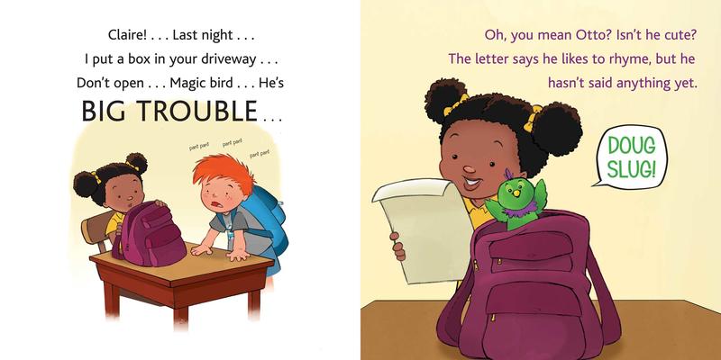 Otto, the rhyming parrot, is causing a little bit of trouble for Doug’s friend Claire. Claire brings Otto to school and the little feathered fellow, who rhymed Doug’s name with everything from mug to pug to bug, uses Claire’s moniker as a jumping off point. All starts off innocently enough: fair and share, but then takes a decidedly more dangerous turn from bear to flare! How can one little parrot cause so much trouble?