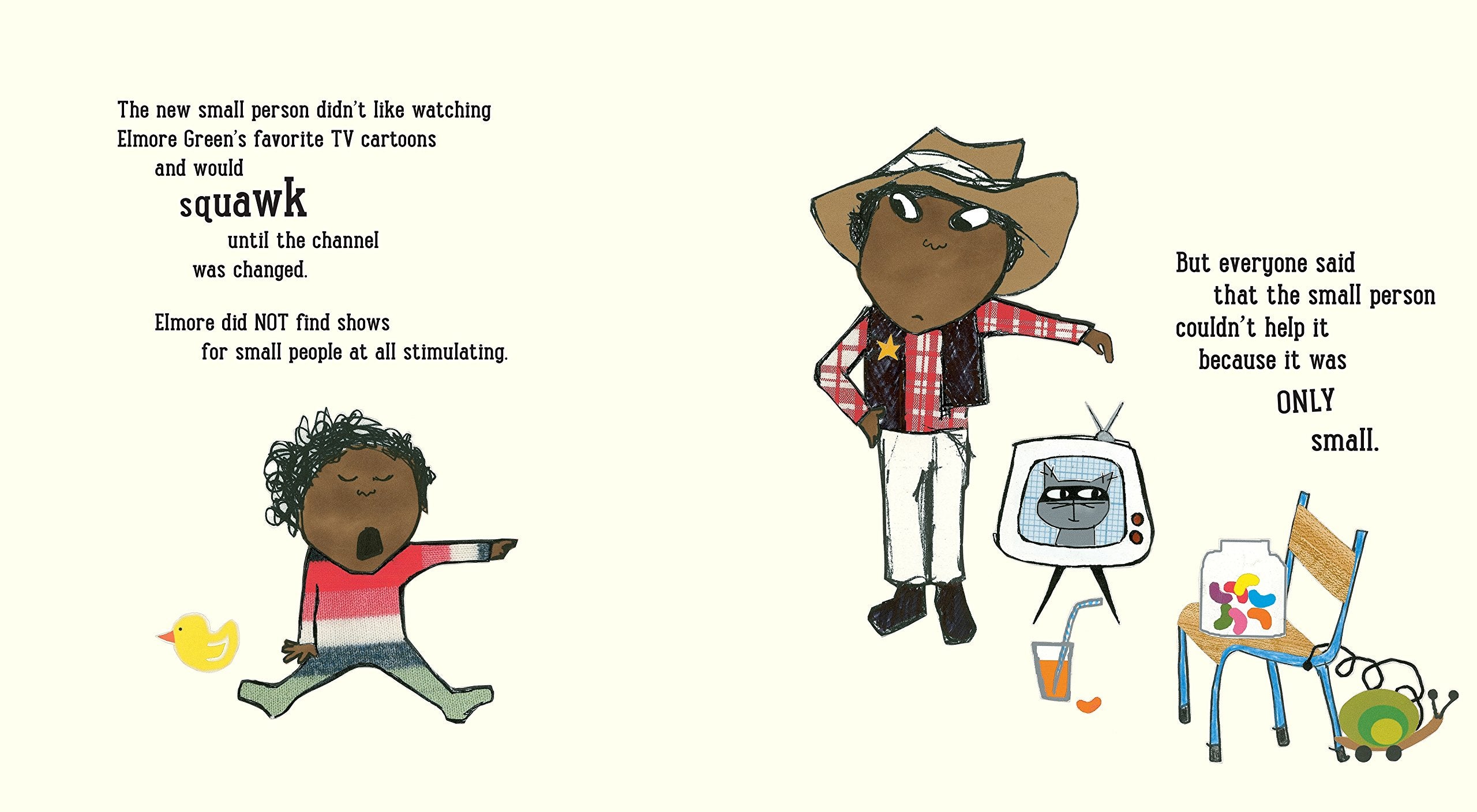 Elmore Green starts life as an only child, as many children do. He has a room to himself, where he can line up his precious things and nobody will move them one inch. But one day everything changes. When the new small person comes along, it seems that everybody might like it a bit more than they like Elmore Green. And when the small person knocks over Elmore’s things and even licks his jelly-bean collection, Elmore’s parents say that he can’t be angry because the small person is only small. Elmore wants the small person to go back to wherever it came from. Then, one night, everything changes. . . . In her signature visual style, Lauren Child gets to the heart of a child’s evolving emotions about becoming a big brother or sister.