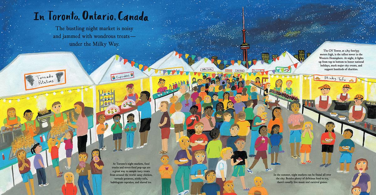 Beneath a blanket of stars, crowds cheer at Little League games, campers share fireside stories, bull-riders hold on tight, and sled dogs race through falling snow — all under the Milky Way. Vivid artwork, engaging verses, and facts about the United States and Canada will captivate readers of all ages in a joyful offering from Frané Lessac.